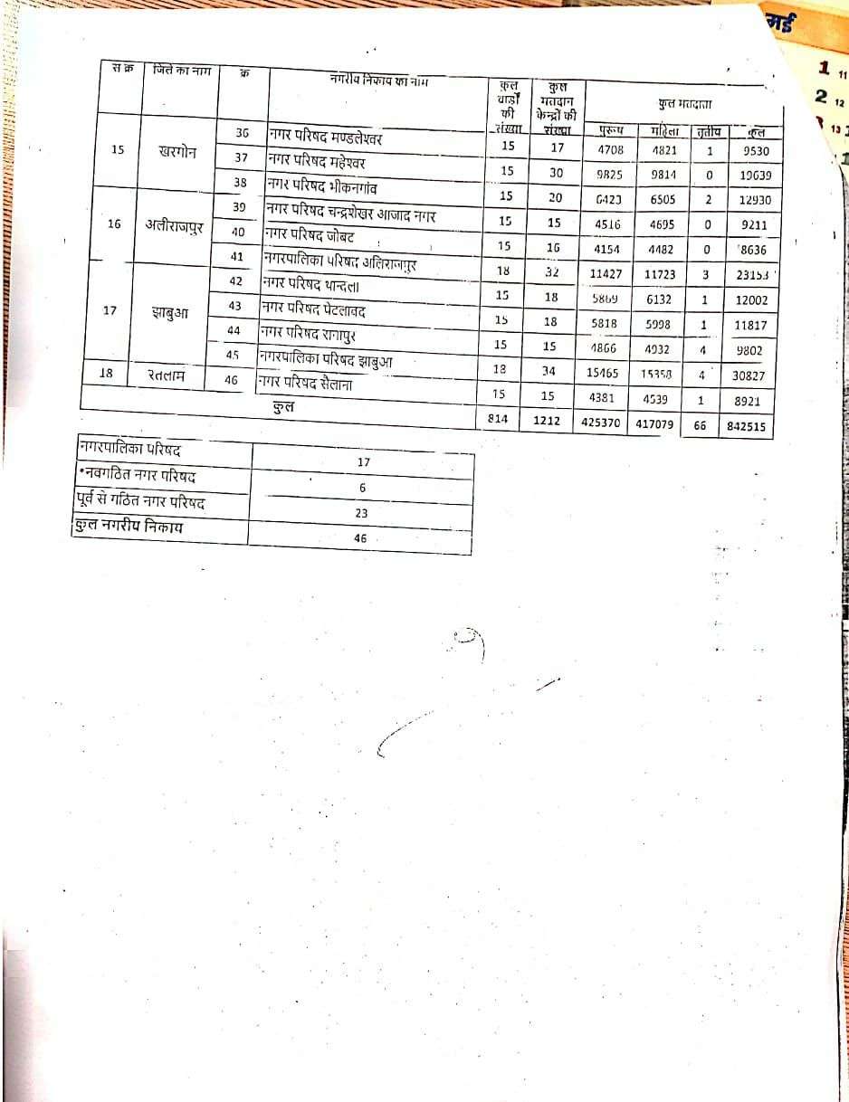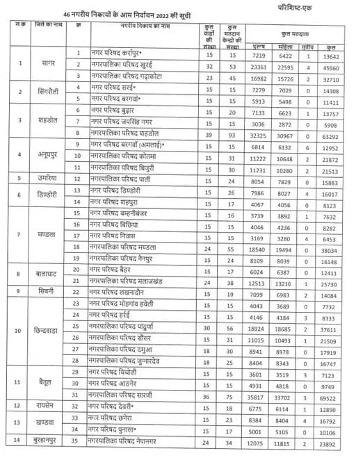 चुनावी अपडेट के मुताबिक 18 जिलों में चुनाव हो रहा है। जिसमें 46 निकायों में चुनाव होने हैं, इसके लिए कुल वार्ड संख्या 814 निर्धारित की गई है जबकि मतदान केंद्र 1222 तैयार किए गए हैं। वही मतदाताओं की संख्या की बात करें तो 8 लाख 42 हजार 515 मतदाता अपने मताधिकार का प्रयोग करेंगे। जिसमें पुरुष मतदाताओं की संख्या 4 लाख 25 हजार 370 है। वही महिला मतदाता की संख्या 4 लाख 17 हजार 079 है।