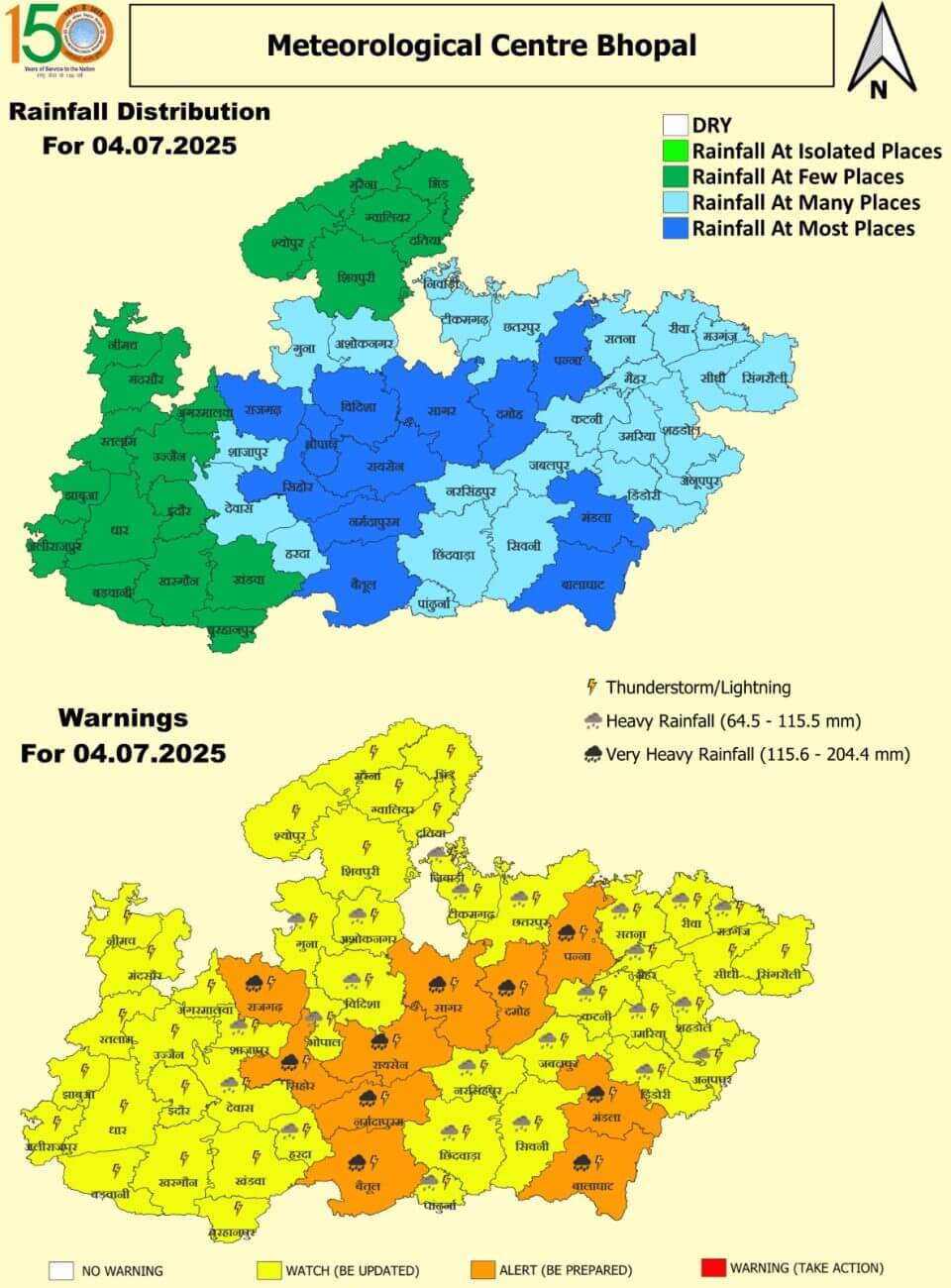 शुक्रवार 4 जुलाई: राजगढ़, सीहोर, बैतूल, नर्मदापुरम, रायसेन,सागर, दमोह, पन्ना, मंडला और बालाघाट में अति भारी बारिश का ऑरेंज अलर्ट । भोपाल, शाजापुर, देवास, गुना, अशोकनगर, विदिशा, हरदा, पांढुर्णा, छिंदवाड़ा, नरसिंहपुर, सिवनी, जबलपुर, डिंडौरी, अनूपपुर, कटनी, उमरिया, शहडोल, मैहर, सतना, रीवा, मऊगंज, छतरपुर, टीकमगढ़ और निवाड़ी में भारी बारिश का यलो अलर्ट ।