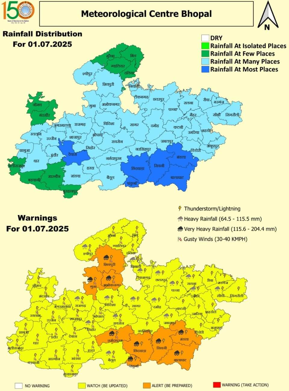 मंगलवार 1 जुलाईः गुना, अशोकनगर, शिवपुरी, नर्मदापुरम,छिंदवाड़ा, पांढुर्णा, सिवनी, मंडला और बालाघाट में अति भारी बारिश का ऑरेंज अलर्ट । श्योपुर, राजगढ़, सीहोर, विदिशा, बैतूल, रायसेन, सागर, निवाड़ी, टीकमगढ़, छतरपुर, दमोह, जबलपुर, मैहर, सतना, पन्ना, सीधी में भारी बारिश ।भोपाल, इंदौर, उज्जैन, ग्वालियर में हल्की बारिश का दौर ।