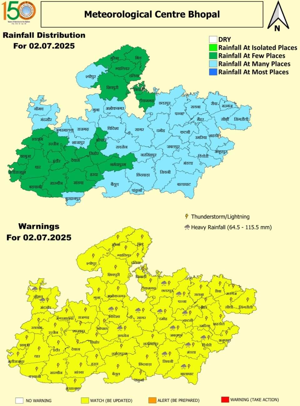 बुधवार 2 जुलाई: नीमच, मंदसौर, विदिशा, रायसेन, सागर, छतरपुर, दमोह, पन्ना, कटनी, जबलपुर, सिवनी, मंडला, डिंडौरी और बालाघाट में भारी बारिश का अलर्ट । अन्य जिलों में हल्की से मध्यम बारिश का यलो अलर्ट ।