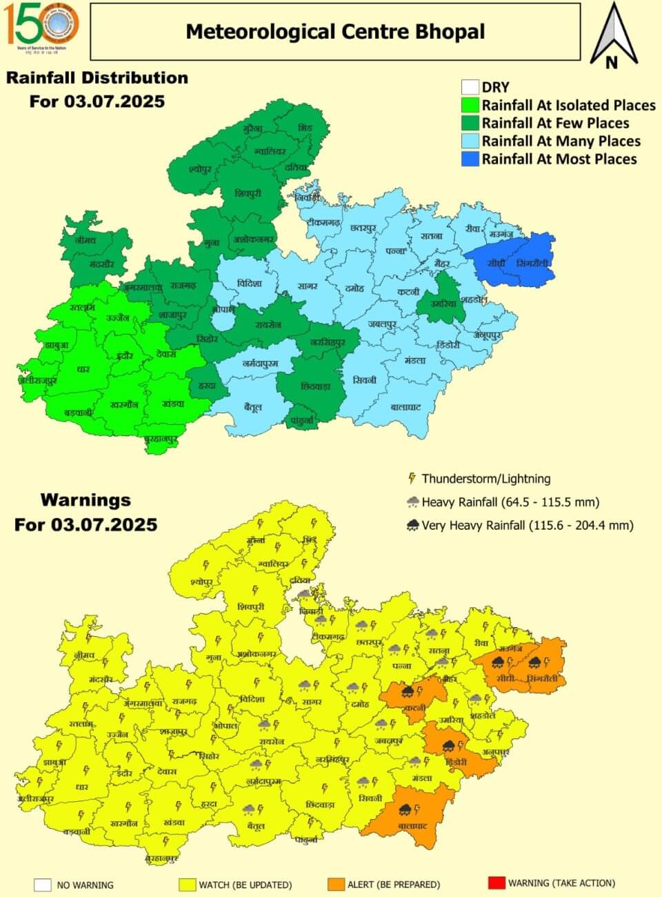 गुरूवार 3 जुलाई: सीधी, सिंगरौली, कटनी, डिंडौरी, बालाघाट में अति भारी बारिश का ऑरेंज अलर्ट। निवाड़ी, टीकमगढ़, छतरपुर, पन्ना, सतना, मैहर, शहडोल, दमोह, जबलपुर, मंडला, सिवनी, सागर, रायसेन, नर्मदापुरम और बैतूल में भारी बारिश ।