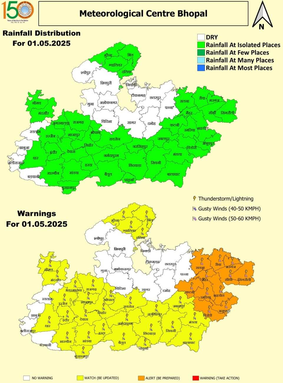 - 4 मई: ग्वालियर, जबलपुर, मंदसौर, रतलाम, झाबुआ, श्योपुर, मुरैना, भिंड, दतिया, शिवपुरी, गुना, अशोकनगर, निवाड़ी, टीकमगढ़, छतरपुर, सागर, दमोह, नरसिंहपुर, नर्मदापुरम, हरदा, बैतूल, छिंदवाड़ा, पांढुर्णा, सिवनी, बालाघाट, मंडला, डिंडौरी, अनूपपुर, शहडोल, उमरिया, कटनी, मैहर, सीधी, सिंगरौली, रीवा, मऊगंज, सतना में तेज आंधी और गरज-चमक की स्थिति ।