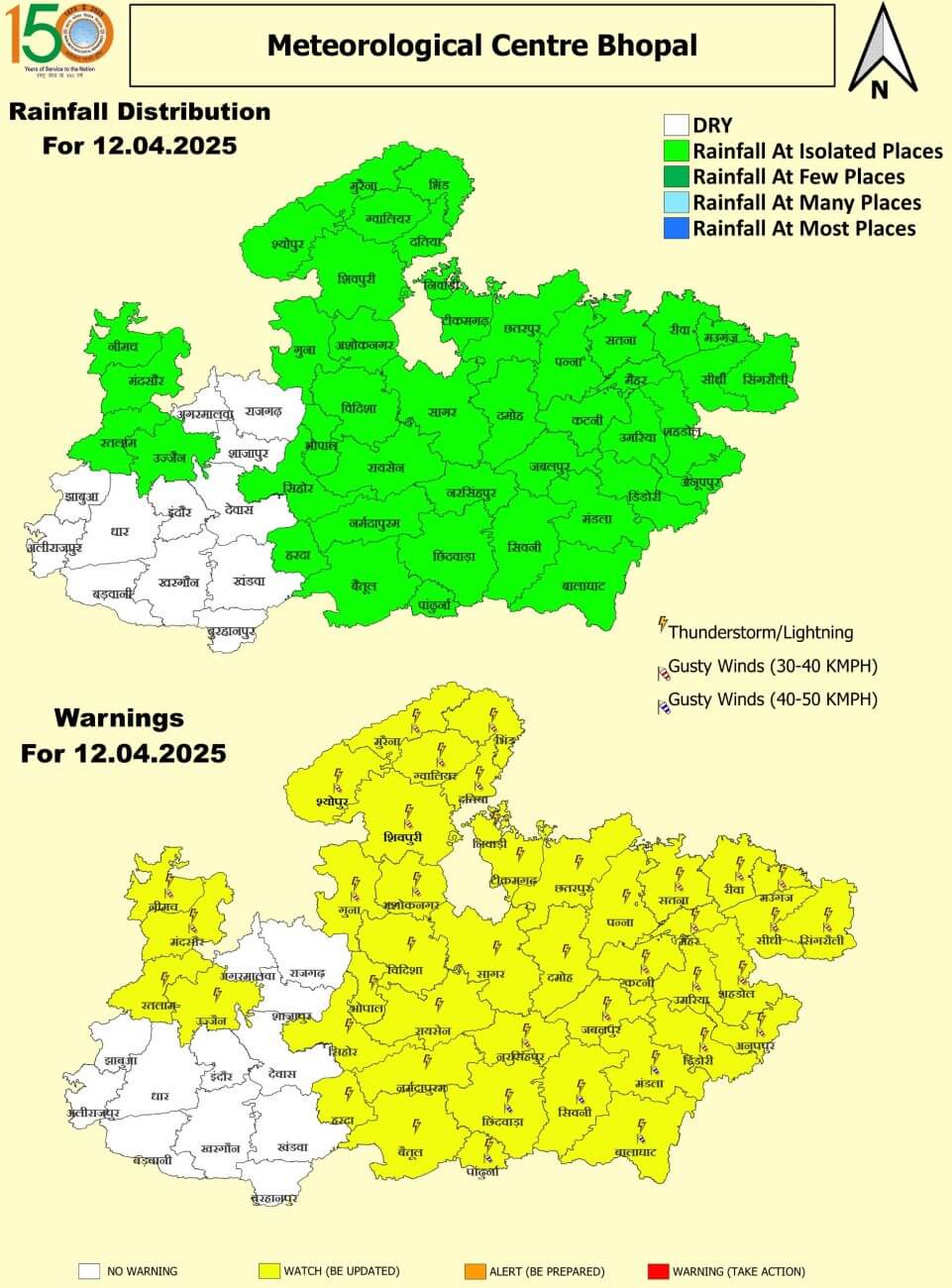 छिंदवाड़ा, सिवनी, मंडला, बालाघाट, पांढुर्णा, गुना, अशोकनगर, शिवपुरी जिले में ओलावृष्टि की साथ तेज बारिश की चेतावनी जारी की गई है। ग्वालियर, दतिया, भिंड, मुरैना, श्योपुर, कला, पन्ना, दमोह, सागर, छतरपुर, टीकमगढ़, निवाड़ी, सिंगरौली, सीधी, रीवा, मऊगंज, सतना, अनूपपुर, शहडोल, उमरिया, डिंडोरी, कटनी, जबलपुर, नरसिंहपुर और मैहर जिलों में वज्रपात के साथ तेज हवाएं चलने का अनुमान है।