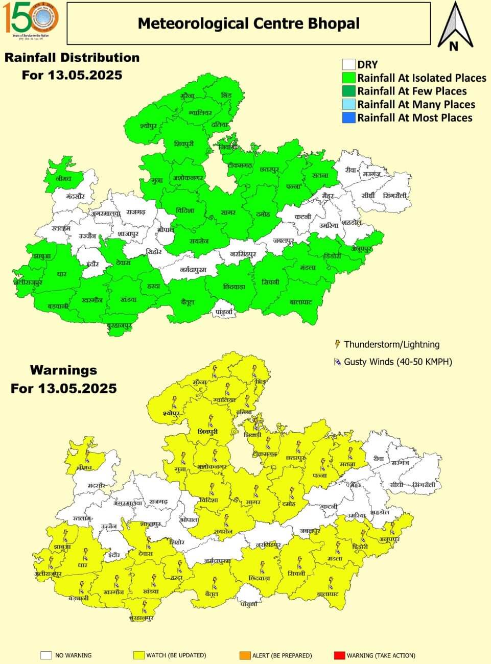 - 13 मई मंगलवार : ग्वालियर, श्योपुर, मुरैना, भिंड, शिवपुरी, दतिया, गुना, अशोकनगर, विदिशा, रायसेन, सागर, दमोह, निवाड़ी, टीकमगढ़, छतरपुर, पन्ना, सतना, अनूपपुर, डिंडौरी, मंडला, बालाघाट, सिवनी, छिंदवाड़ा, बैतूल, हरदा, देवास, खंडवा, बुरहानपुर, खरगोन, बड़वानी, धार, अलीराजपुर और झाबुआ में बारिश।