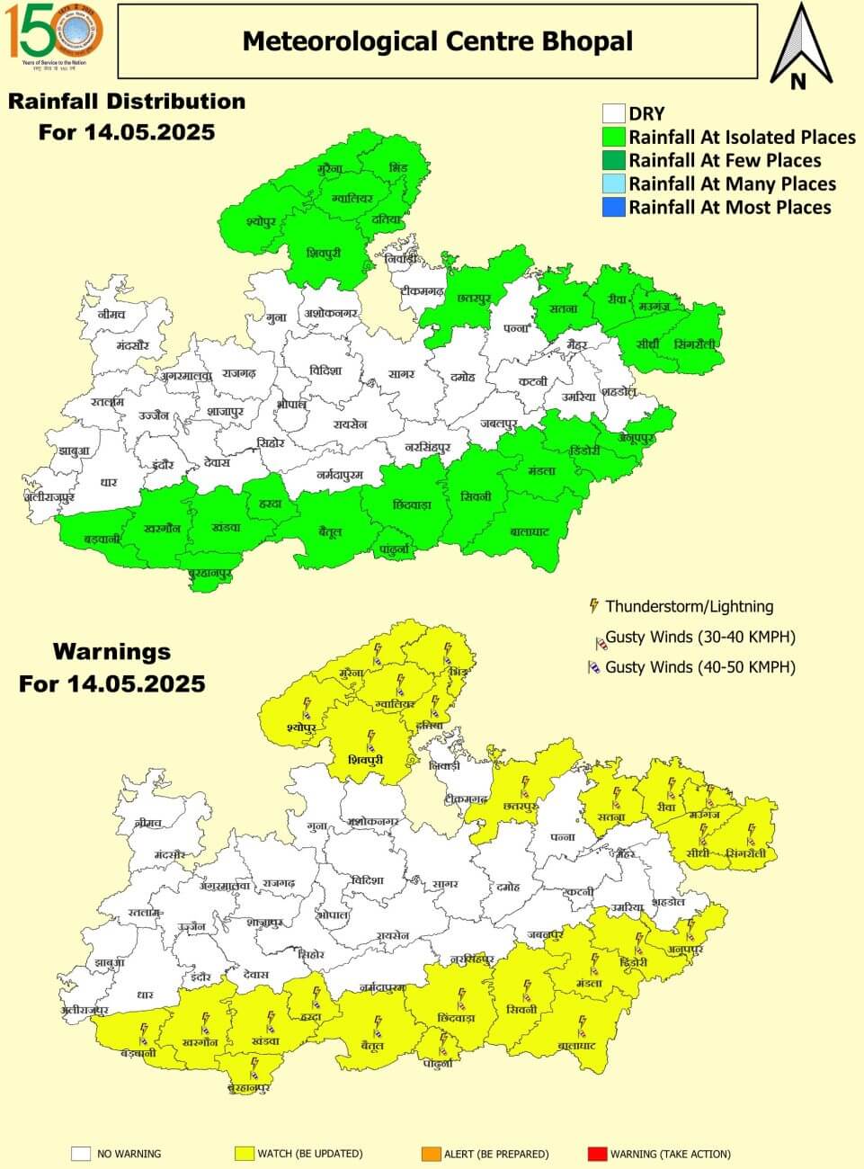 - 14 मई बुधवार : ग्वालियर, श्योपुर, मुरैना, भिंड, दतिया, शिवपुरी, छतरपुर, सतना, रीवा, मऊगंज, सीधी, सिंगरौली, अनूपपुर, डिंडौरी, मंडला, बालाघाट, सिवनी, छिंदवाड़ा, पांढुर्णा, बैतूल, हरदा, खंडवा, बुरहानपुर, खरगोन, बड़वानी में गरज-चमक, हल्की बारिश और आंधी ।