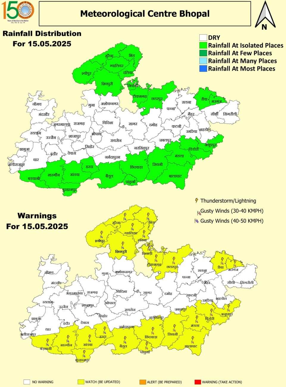 - 15 मई गुरूवार : ग्वालियर, श्योपुर, मुरैना, भिंड, शिवपुरी, दतिया, निवाड़ी, टीकमगढ़, छतरपुर, रीवा, अनूपपुर, डिंडौरी, मंडला, बालाघाट, सिवनी, छिंदवाड़ा, पांढुर्णा, बैतूल, हरदा, खंडवा, बुरहानपुर, खरगोन और बड़वानी में गरज-चमक और आंधी की स्थिति ।