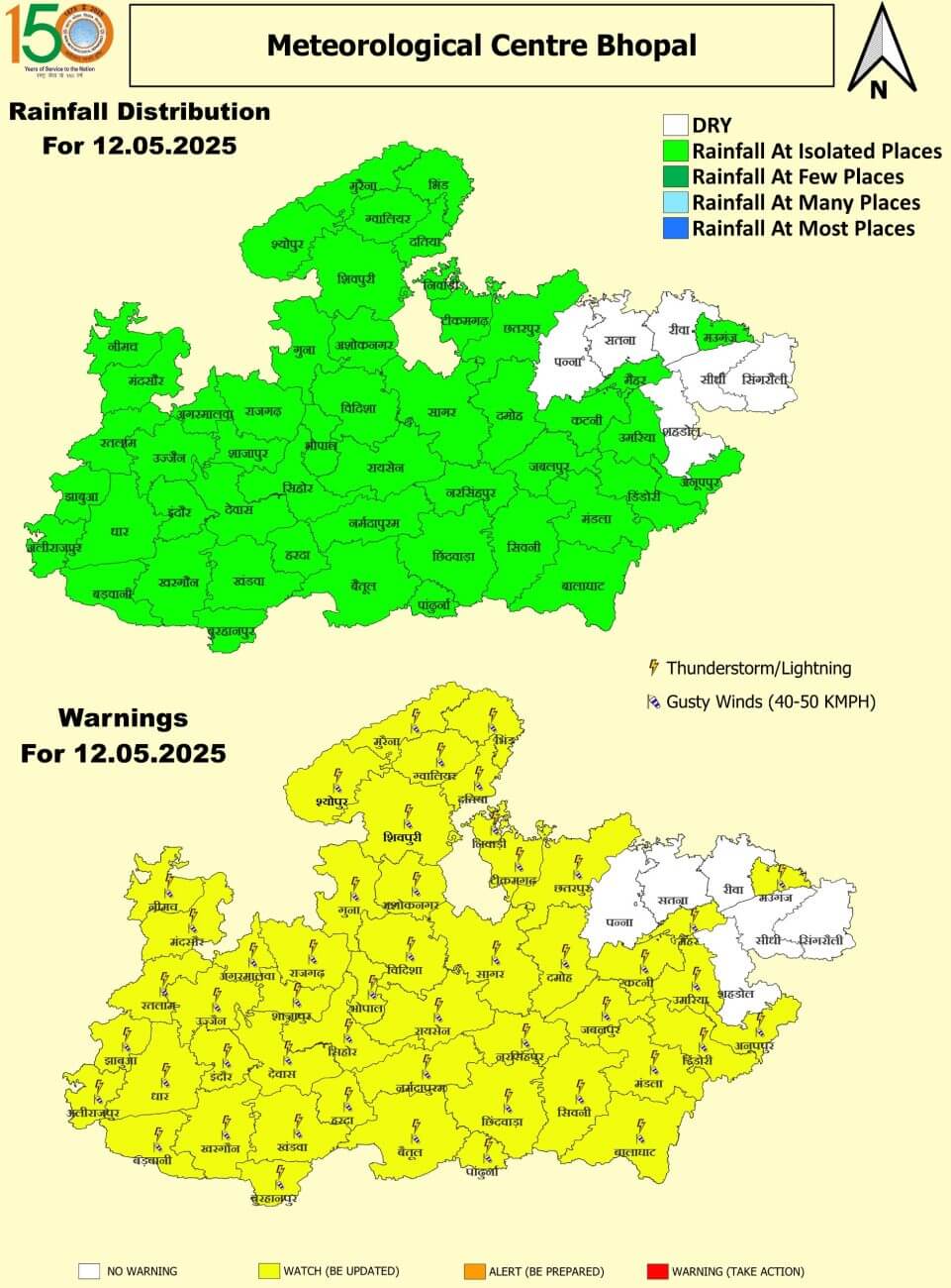 - 12 मई सोमवार : भोपाल, इंदौर, उज्जैन, ग्वालियर, जबलपुर, श्योपुर,मुरैना, भिंड, दतिया, शिवपुरी, गुना, अशोकनगर, विदिशा, रायसेन, नर्मदापुरम, बैतूल, सीहोर, हरदा, राजगढ़, शाजापुर, देवास, खंडवा, बुरहानपुर, खरगोन, आगर-मालवा, बड़वानी, धार, अलीराजपुर, झाबुआ, रतलाम, नीमच, मंदसौर, निवाड़ी, टीकमगढ़, सागर, दमोह, नरसिंहपुर, छिंदवाड़ा, पांढुर्णा, सिवनी, बालाघाट, मंडला, डिंडौरी, अनूपपुर, उमरिया, कटनी, मैहर, सीधी में हल्की बारिश और आंधी ।