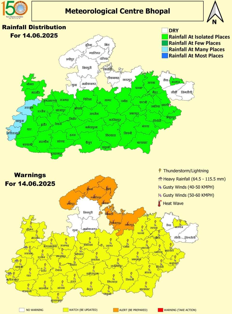 - 14 जून शनिवार: ग्वालियर, भिंड, मुरैना, श्योपुर, दतिया, निवाड़ी, टीकमगढ़, छतरपुर में लू का अलर्ट।रतलाम, झाबुआ और अलीराजपुर में तेज बारिश । भोपाल, इंदौर, उज्जैन, जबलपुर, आगर-मालवा, धार, बड़वानी, खरगोन, राजगढ़, शाजापुर, देवास, खंडवा, बुरहानपुर, हरदा, सीहोर, विदिशा, रायसेन, नर्मदापुरम, बैतूल, सागर, नरसिंहपुर, छिंदवाड़ा, पांढुर्णा, दमोह, पन्ना, सतना, मऊगंज, मैहर, कटनी, उमरिया, शहडोल, अनूपपुर, डिंडौरी, मंडला, बालाघाट में तेज आंधी, गरज-चमक और हल्की बारिश ।
