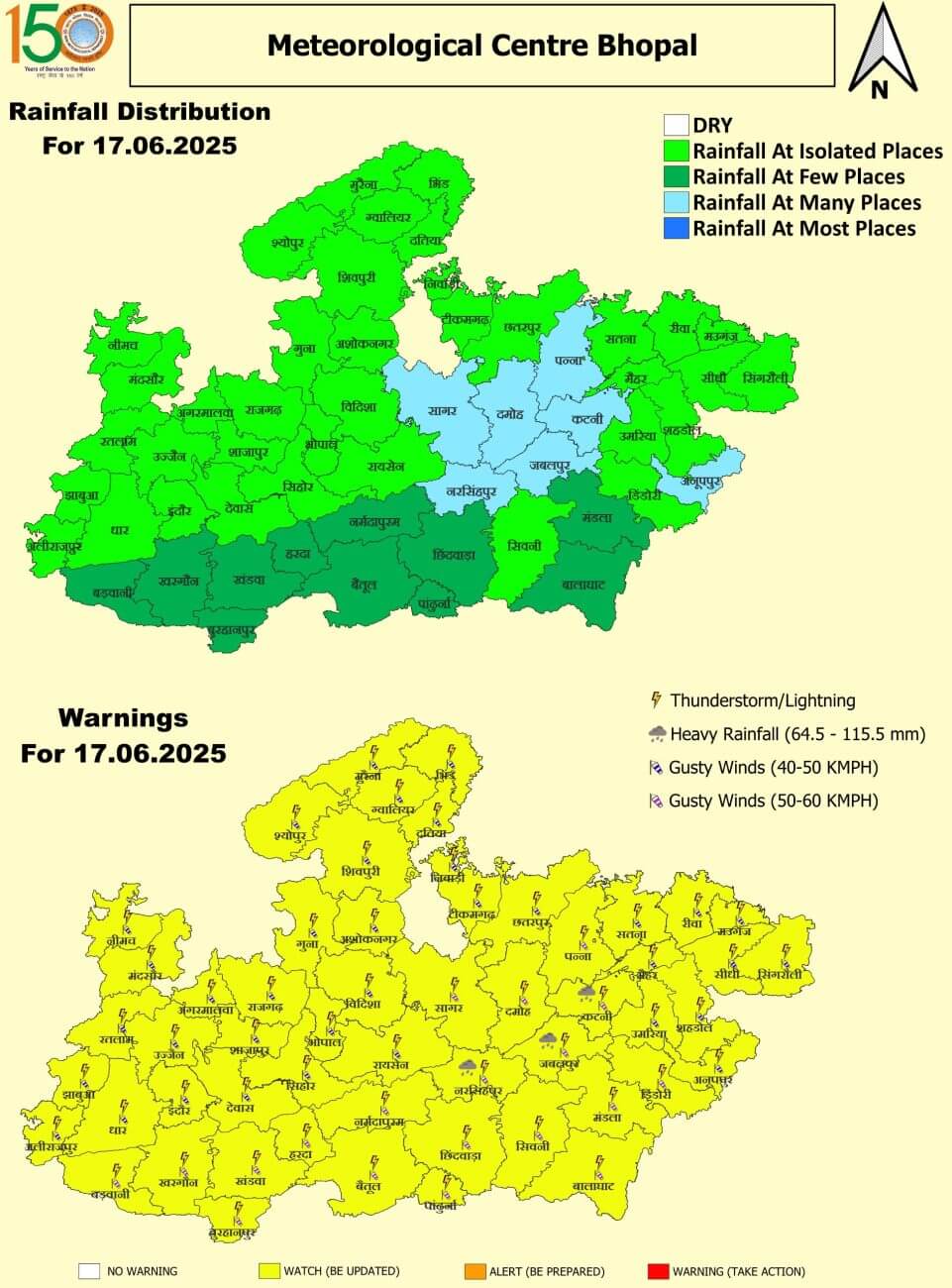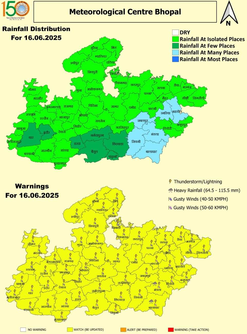 - 15 जून रविवार: भोपाल, इंदौर, उज्जैन, ग्वालियर, मुरैना, भिंड, दतिया, रीवा, सीधी, सिंगरौली, पन्ना, दमोह, मंडला, बालाघाट, सिवनी, पांढुर्णा, छिंदवाड़ा, नरसिंहपुर, सागर, विदिशा, रायसेन, नर्मदापुरम, बैतूल, हरदा, सीहोर, शाजापुर, देवास, खंडवा, बुरहानपुर, खरगोन, बड़वानी, धार, अलीराजपुर, झाबुआ, रतलाम, मंदसौर, श्योपुर, शिवपुरी, अशोकनगर, गुना, राजगढ़, आगर-मालवा, सतना, मैहर, मऊगंज, कटनी, जबलपुर, उमरिया, शहडोल, अनूपपुर, डिंडौरी और नीमच में बारिश /हवा की रफ्तार 40 से 60 किलोमीटर प्रतिघंटा ।