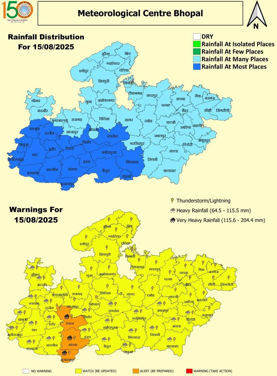- रायसेन, सिहोर, नर्मदापुरम, बैतूल, हरदा, खरगौन, बड़वानी, अलीराजपुर, झाबुआ, धार, इंदौर, रतलाम, उज्जैन, मंदसौर, नीमच, डिंडोरी, जबलपुर, नरसिंहपुर, छिंदवाड़ा, सिवनी, मंडला, बालाघाट, पांढुर्णा में भारी बारिश, झंझावत और वज्रपात।