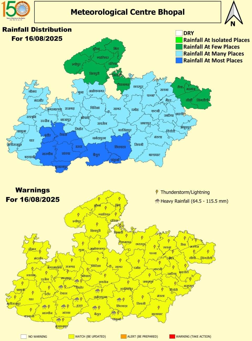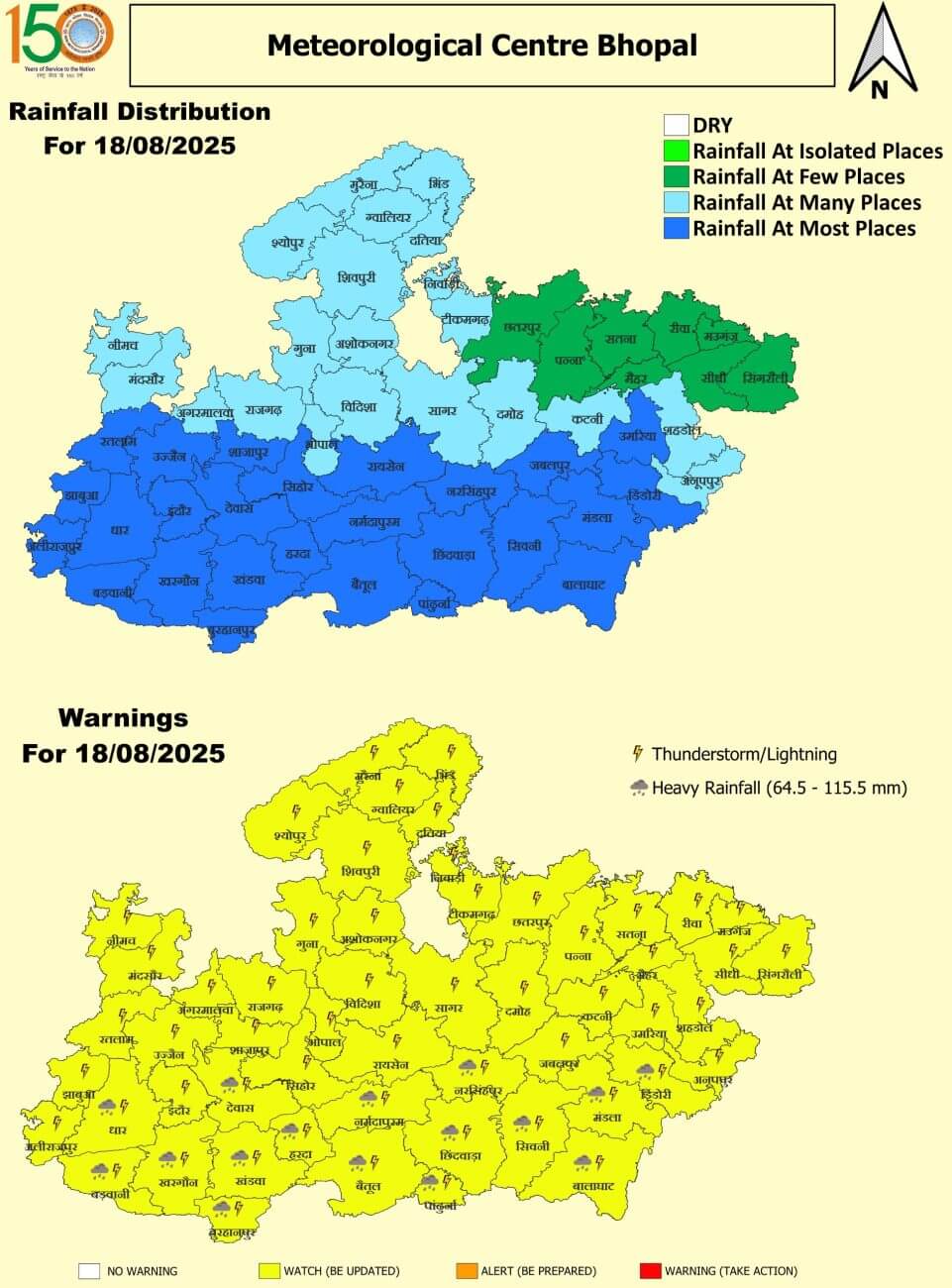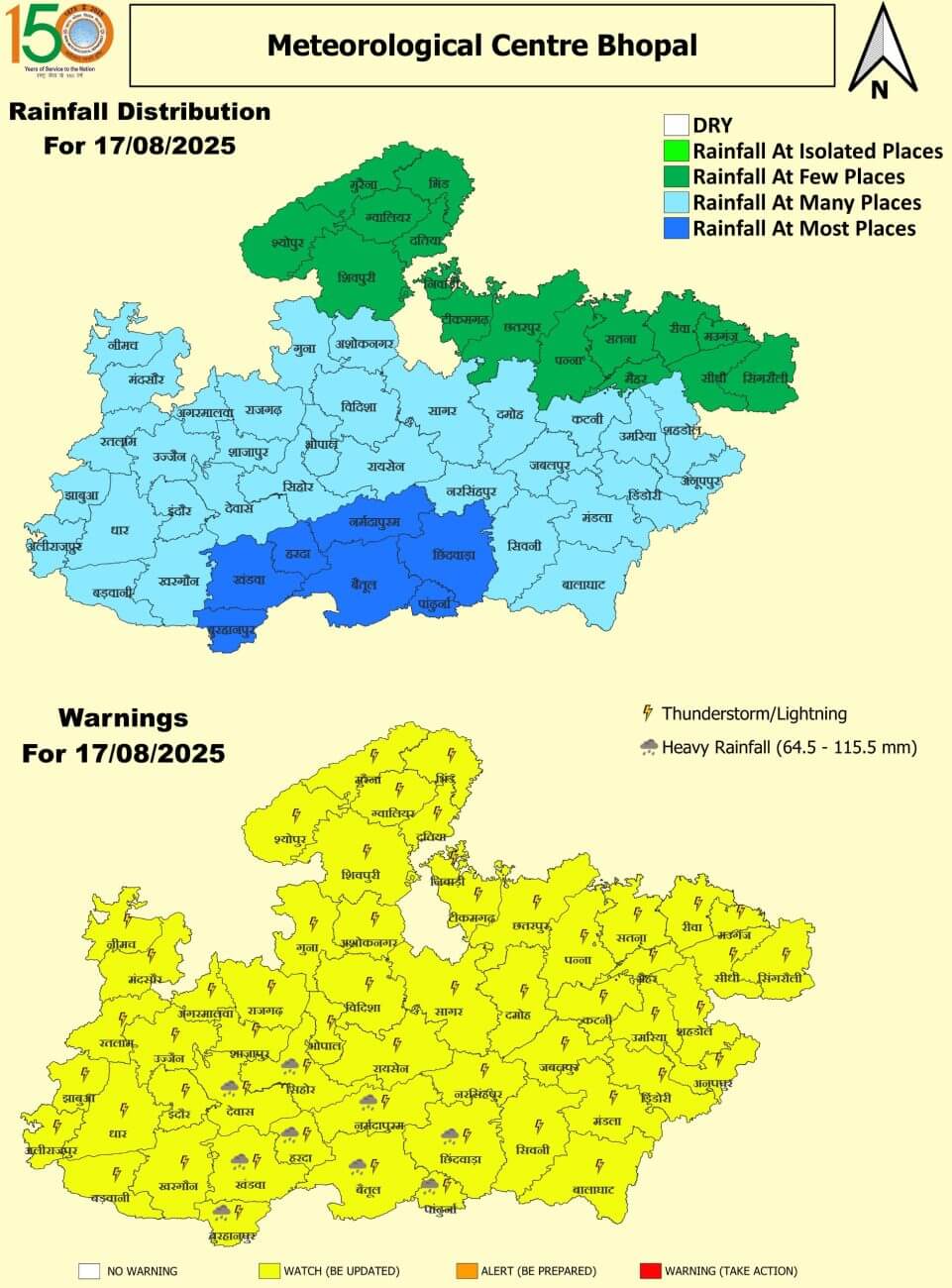 - भोपाल, विदिशा, राजगढ़, शाजापुर, आगर, गुना, अशोकनगर, शिवपुरी, ग्वालियर, दतिया, भिंड, मुरैना, श्योपुरकलां, सिंगरौली, सीधी, रीवा, मऊगंज, सतना, अनुपपुर, शहडोल, उमरिया, कटनी, पन्ना, दमोह, सागर, छतरपुर, टीकमगढ़, निवाड़ी, मैहर में झंझावत वज्रपात