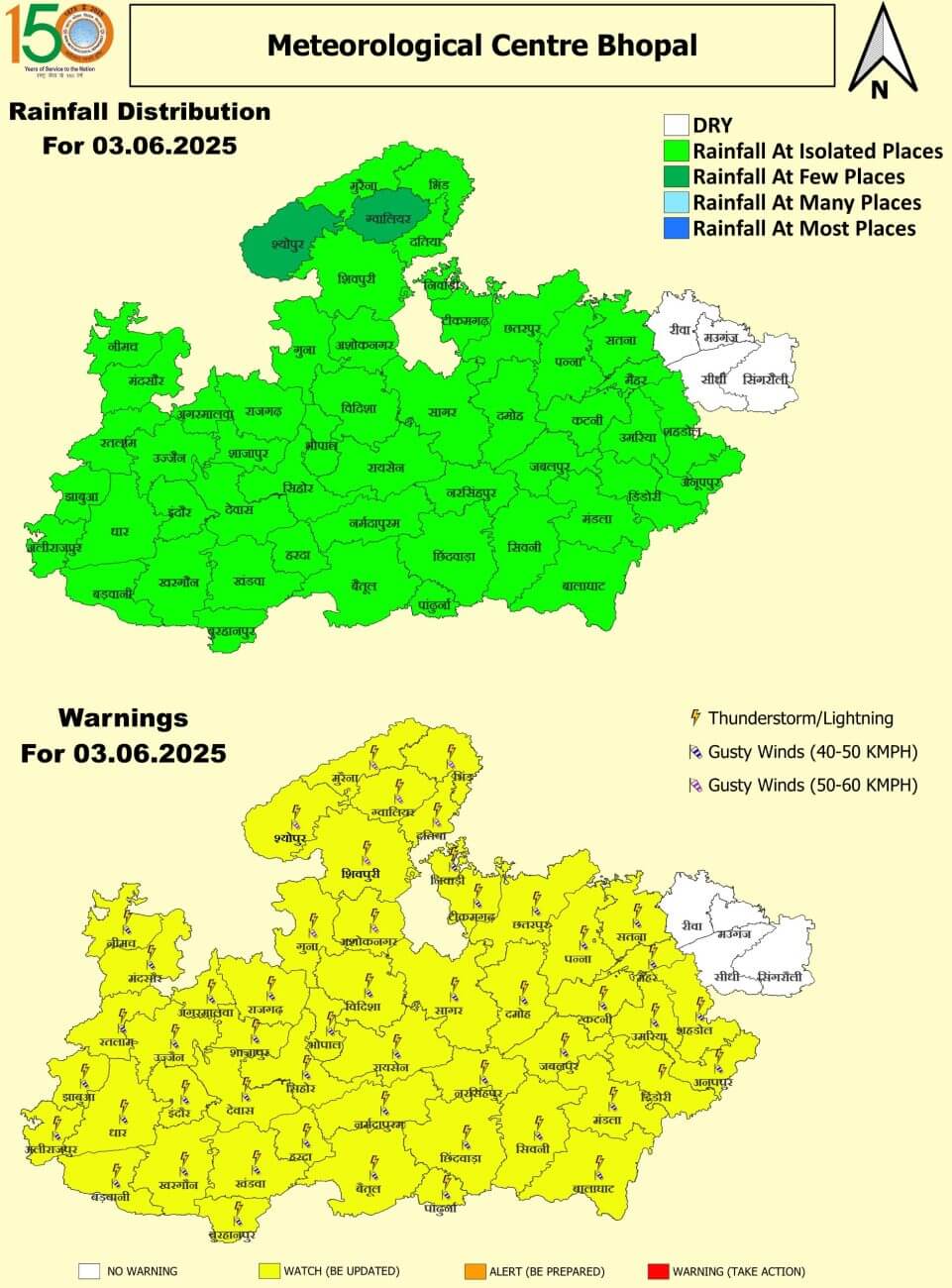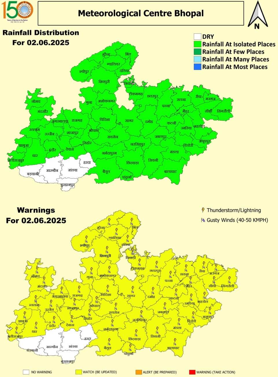 2 जून सोमवार: भोपाल, इंदौर, उज्जैन, ग्वालियर, मुरैना, भिंड, दतिया, निवाड़ी, टीकमगढ़, छतरपुर, रीवा, सीधी, सिंगरौली, पन्ना, दमोह, मंडला, बालाघाट, सिवनी, पांढुर्णा, छिंदवाड़ा, नरसिंहपुर, सागर, विदिशा, रायसेन, नर्मदापुरम, बैतूल, सीहोर, शाजापुर, देवास, धार, अलीराजपुर, झाबुआ, रतलाम, मंदसौर, श्योपुर, शिवपुरी, अशोकनगर, गुना, राजगढ़, आगर-मालवा, सतना, मैहर, मऊगंज, कटनी, जबलपुर, उमरिया, शहडोल, अनूपपुर, डिंडौरी और नीमच में बारिश/हवा की रफ्तार 40 से 50 किलोमीटर प्रतिघंटा तक।