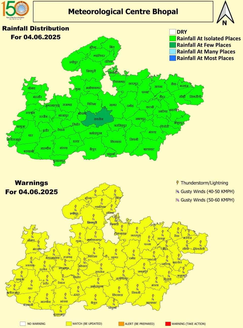4 जून बुधवार: भोपाल, इंदौर, उज्जैन, ग्वालियर, मुरैना, भिंड, दतिया, निवाड़ी, टीकमगढ़, छतरपुर, रीवा, सीधी, सिंगरौली, पन्ना, दमोह, मंडला, बालाघाट, सिवनी, पांढुर्णा, छिंदवाड़ा, नरसिंहपुर, सागर, विदिशा, रायसेन, नर्मदापुरम, बैतूल, हरदा, सीहोर, शाजापुर, देवास, खंडवा, बुरहानपुर, खरगोन, बड़वानी, धार, अलीराजपुर, झाबुआ, रतलाम, मंदसौर, श्योपुर, शिवपुरी, अशोकनगर, गुना, राजगढ़, आगर-मालवा, सतना, मैहर, मऊगंज, कटनी, जबलपुर, उमरिया, शहडोल, अनूपपुर, डिंडौरी और नीमच में बारिश/हवा की रफ्तार 40 से 50 किलोमीटर प्रतिघंटा तक ।