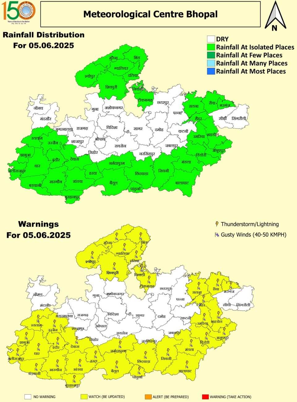 5 जून गुरूवार: इंदौर, उज्जैन, ग्वालियर, श्योपुर, मुरैना, भिंड, दतिया, शिवपुरी, निवाड़ी, टीकमगढ़, सतना, रीवा, मैहर, उमरिया, शहडोल, अनूपपुर, डिंडौरी, मंडला, बालाघाट, सिवनी, छिंदवाड़ा, पांढुर्णा, बैतूल, नर्मदापुरम, हरदा, खंडवा, बुरहानपुर, देवास, खरगोन, बड़वानी, धार, रतलाम, झाबुआ और अलीराजपुर में आंधी-बारिश का अलर्ट ।