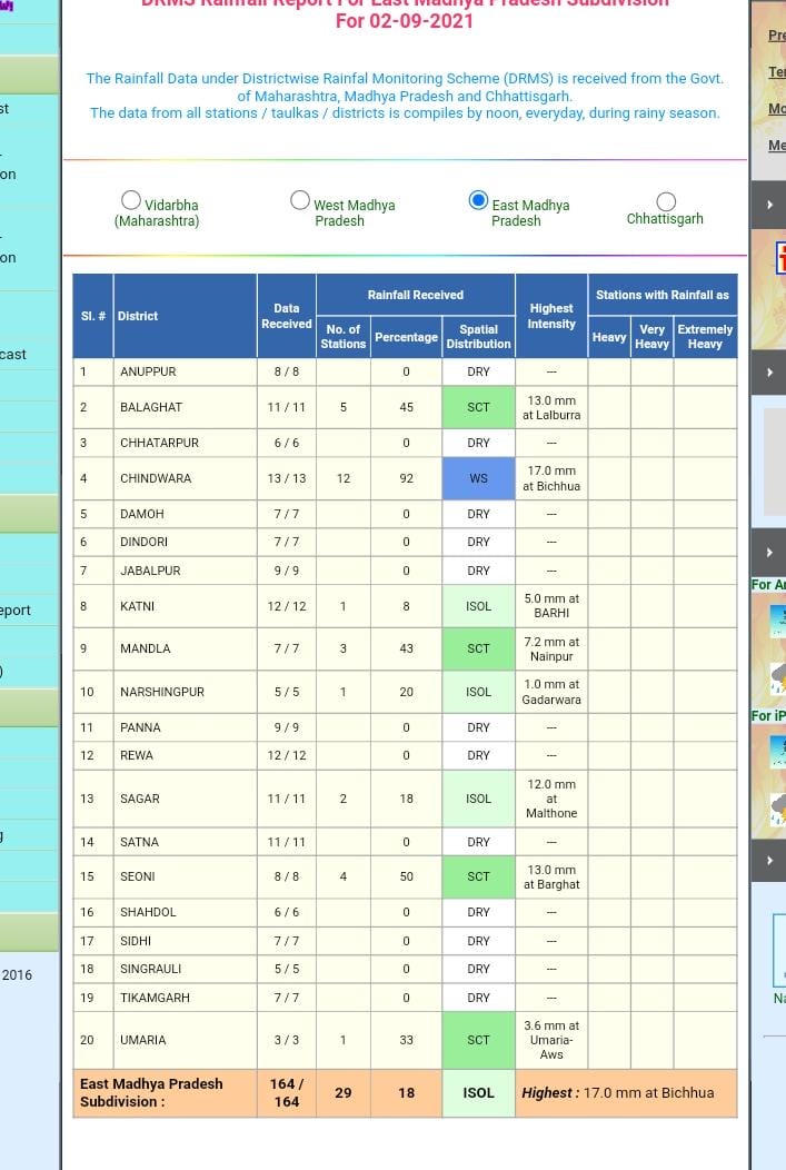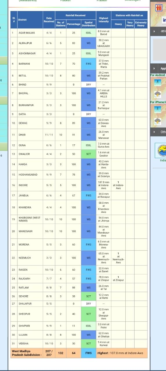 बीते 24 घंटों के दौरान इंदौर में 4.5 इंच, खंडवा 2 इंच, रतलाम, धार, खरगोन, गुना, उज्जैन, होशंगाबाद, भोपाल, पचमढ़ी, श्योपुरकलां, ग्वालियर, बैतूल, राजगढ़, उमरिया और मलाजखंड के बारिश दर्ज की गई है।