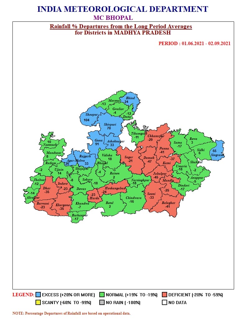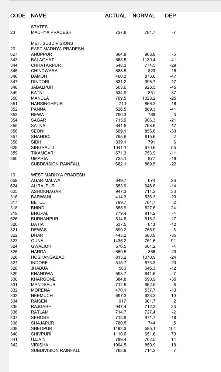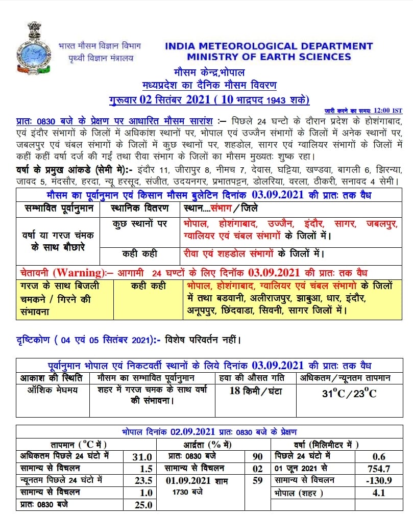 मौसम विभाग (MP Weather Department) के अनुसार, 6 सितंबर से फिर भारी बारिश का दौर शुरु होने की संभावना है। इसके लिए 5 सितंबर को बंगाल की खाड़ी में एक निम्न दबाव का क्षेत्र बनने जा रहा है, जिसके प्रभाव से 6 सितंबर से भोपाल समेत प्रदेश भर में अच्छी बारिश होगी। वही 7 और 8 सितंबर को प्रदेश के कई इलाकों में तेज बारिश होगी और इससे प्यासे कई जिलों को राहत भी मिलेगी, हालांकि सूखे की चपेट में आ चुके जबलपुर में अभी बारिश होने की उम्मीद कम ही है।पिछले 24 घंटे में भोपाल, इंदौर और रतलाम समेत कई जिलों में बारिश दर्ज की गई।