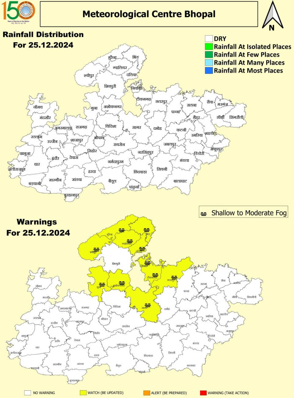 - 25 दिसंबर को ग्वालियर, भिंड, मुरैना, श्योपुर, शिवपुरी, दतिया, निवाड़ी, टीकमगढ़, छतरपुर और पन्ना में कोहरे की संभावना।