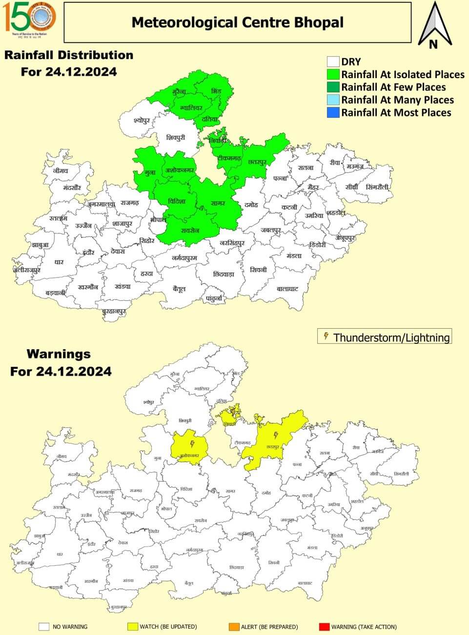- 24 दिसंबर को भिंड, मुरैना, ग्वालियर, दतिया, शिवपुरी, विदिशा, सागर, अशोकनगर, गुना, रायसेन, टीकमगढ़, पन्ना, छतरपुर, निवाड़ी, सतना, रीवा, मऊगंज और सीधी में बादल छाने के साथ बारिश के आसार।
