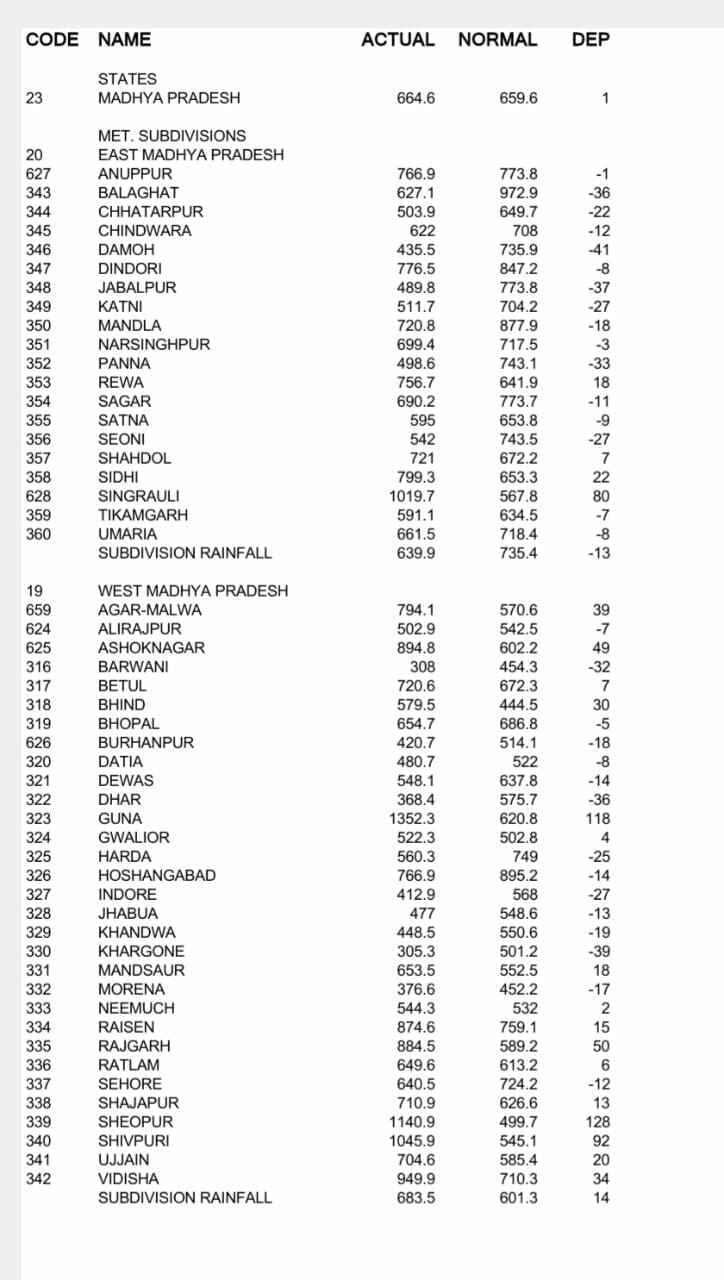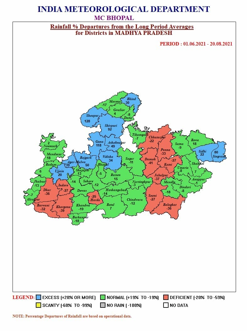 पिछले चौबीस घंटों में होशंगाबाद के पिपरिया में 6 इंच, बैतूल के घोड़ाडोंगरी में 5.5 इंच, भैंसदेही में 4 इंच, चिचोली में 3 इंच, विदिशा के पठारी में 5 इंच, कुरवाई में 4 इंच, उज्जैन के नागदा में 5 इंच, झाबुआ के पेटलावद में 3 इंच, रतलाम शहर में 3 इंच, सागर के केसली में 3.5 इंच, सीधी के बहरी में 3 इंच बारिश हुई है।