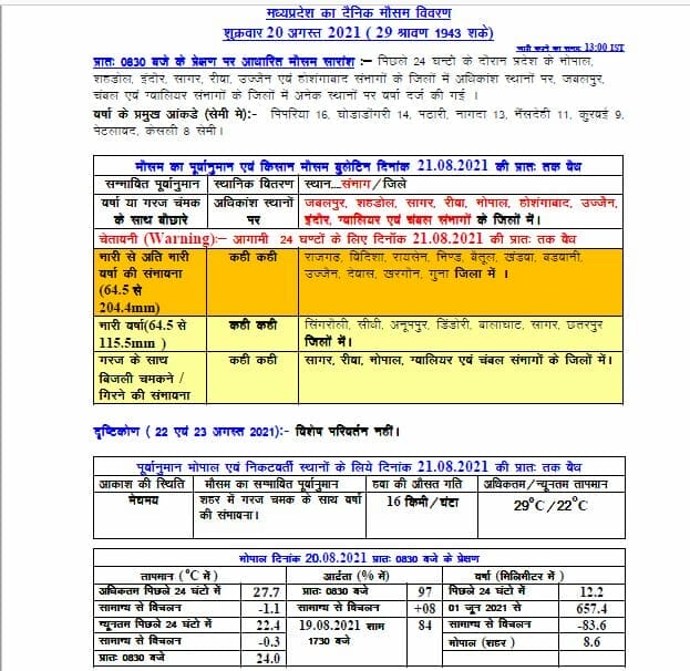 मौसम विभाग के मुताबिक, उत्तर प्रदेश, उत्तराखंड, हिमाचल प्रदेश, हरियाणा और दिल्ली में 23 अगस्त तक मध्यम और कहीं-कहीं भारी बारिश की संभावना है।हिमाचल प्रदेश, हरियाणा, चंडीगढ़, दिल्ली और पश्चिम उत्तर प्रदेश में 20- 21 अगस्त को बारिश होने का अनुमान है। बिहार के कुछ स्थानों पर 20- 22 अगस्त को भारी बारिश हो सकती है। गुजरात, महाराष्ट्र, ओडिशा, झारखंड, पश्चिम बंगाल के गंगा वाले क्षेत्रों में 18 और 19 अगस्त को, मध्यप्रदेश में 18 से 20 अगस्त को, तेलंगाना और छत्तीसगढ़ में 18 अगस्त को बारिश हो सकती है।