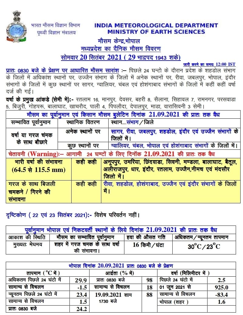 मौसम विभाग (MP Weather alert) ने आज सोमवार 20 सितंबर 2021 को प्रदेश के 14 जिलों अनूपपुर, उमरिया, छिंदवाड़ा, सिवनी, मंडला, बालाघाट, बैतूल, अलीराजपुर, धार, इंदौर, रतलाम, उज्जैन, नीमच, मंदसौर जिलों में भारी बारिश (Heavy Rain) की चेतावनी जारी की है।वही 5 संभागों रीवा, शहडोल, होशंगबाद, इंदौर और उज्जैन में बिजली गिरने और चमकने की संभावना को देखते हुए येलो अलर्ट जारी किया गया है। सागर, रीवा, जबलपुर, शहडोल, इंदौर व उज्जैन संभाग के जिलों में अनेक स्थानों पर व ग्वालियर, चंबल, भोपाल व होशंगाबाद संभाग के कुछ स्थानों पर गरज-चमक के साथ बौछारे पड़ सकती है।