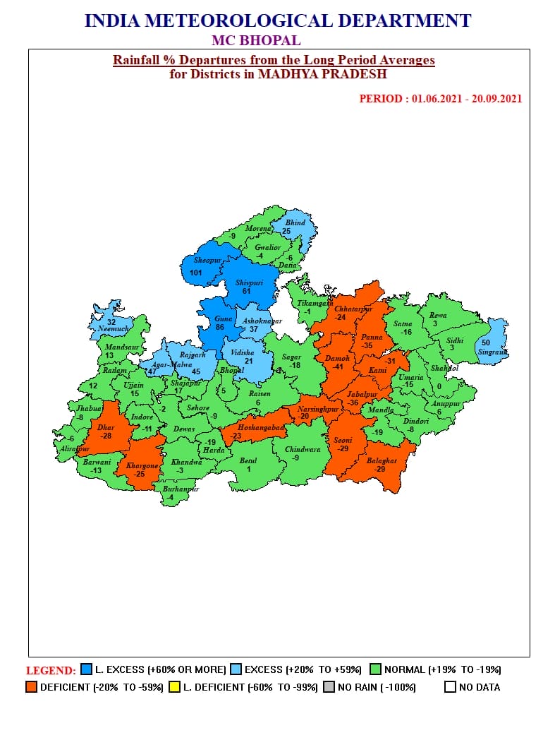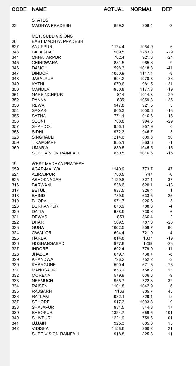 पिछले 24 घंटे के दौरान रतलाम में 16,, मानपुर, देवसर बहरी में आठ, सैलाना, सिहावल में सात, रामनगर, पांच, बिजुरी गोहपरू, बालाघाट, खाचरौद, पाली में चार, पिपलौदा, देपालपुर, माडा, वारासिवनी में तीन सेमी बारिश दर्ज की गई।सबसे ज्यादा रतलाम में 161 मिमी बारिश हुई है। सतना में 3.8 मिमी, खरगोन में 9.8 मिमी, मंडला में 2.5 मिमी, भोपाल में 2.5 मिमी, शाजापुर में 2 मिमी, गुना में 1.6 मिमी, भोपाल शहर में 1.6 मिमी, धार में 0.2 मिमी, उज्जैन में 0.2 मिमी, मलाजखंड में 1.8 मिमी, उमरिया में 1.2 मिमी बारिश दर्ज हुई है।