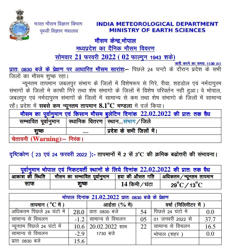 भोपाल, डेस्क रिपोर्ट। मंगलवार 22 फरवरी 2022 को नए पश्चिमी विक्षोभ के सक्रिय होने के चलते मध्य प्रदेश के मौसम (MP Weather Update Today 21 Feb 2022) में बदलाव के संकेत है। एमपी मौसम विभाग (MP Weather Department) की मानें आज 21 फरवरी 2022 को भी मौसम के शुष्क रहने के आसार है, लेकिन 22 फरवरी को एक नए पश्चिमी विक्षोभ के उत्तर भारत में प्रवेश करने के प्रभाव से राजस्थान पर प्रेरित चक्रवात बनने के भी संकेत और हवाओं के रूख में बदलने पर कहीं-कहीं बादल छाने और बौछारे पड़ने के आसार है।