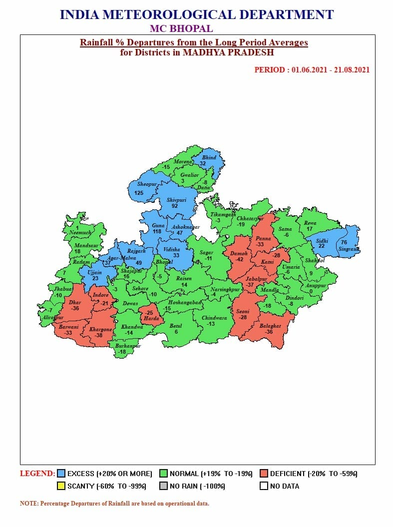 पिछले 24 घंटों में सतना में 54.5, इंदौर में 48.6, खंडवा में 47, शाजापुर में 45, खजुराहो में 41.8, सागर में 39.6, उज्जैन एवं दतिया में 26.6, उमरिया में 24.8, भोपाल (शहर) में 24.0, गुना में 15.8, नौगांव में 13.4, ग्वालियर में 13.3, धार में 12.2, रतलाम में 13, श्योपुरकलां में 10, भोपाल (एयरपोर्ट) में 7.6, रीवा में 7.4, खरगोन में 5.4, सीधी में 4.6, छिंदवाड़ा में 2.2, होशंगाबाद में 2, जबलपुर में 1.3, मंडला में 1, बैतूल में 0.7, मलाजखंड में 0.6 मिलीमीटर बरसात हुई।