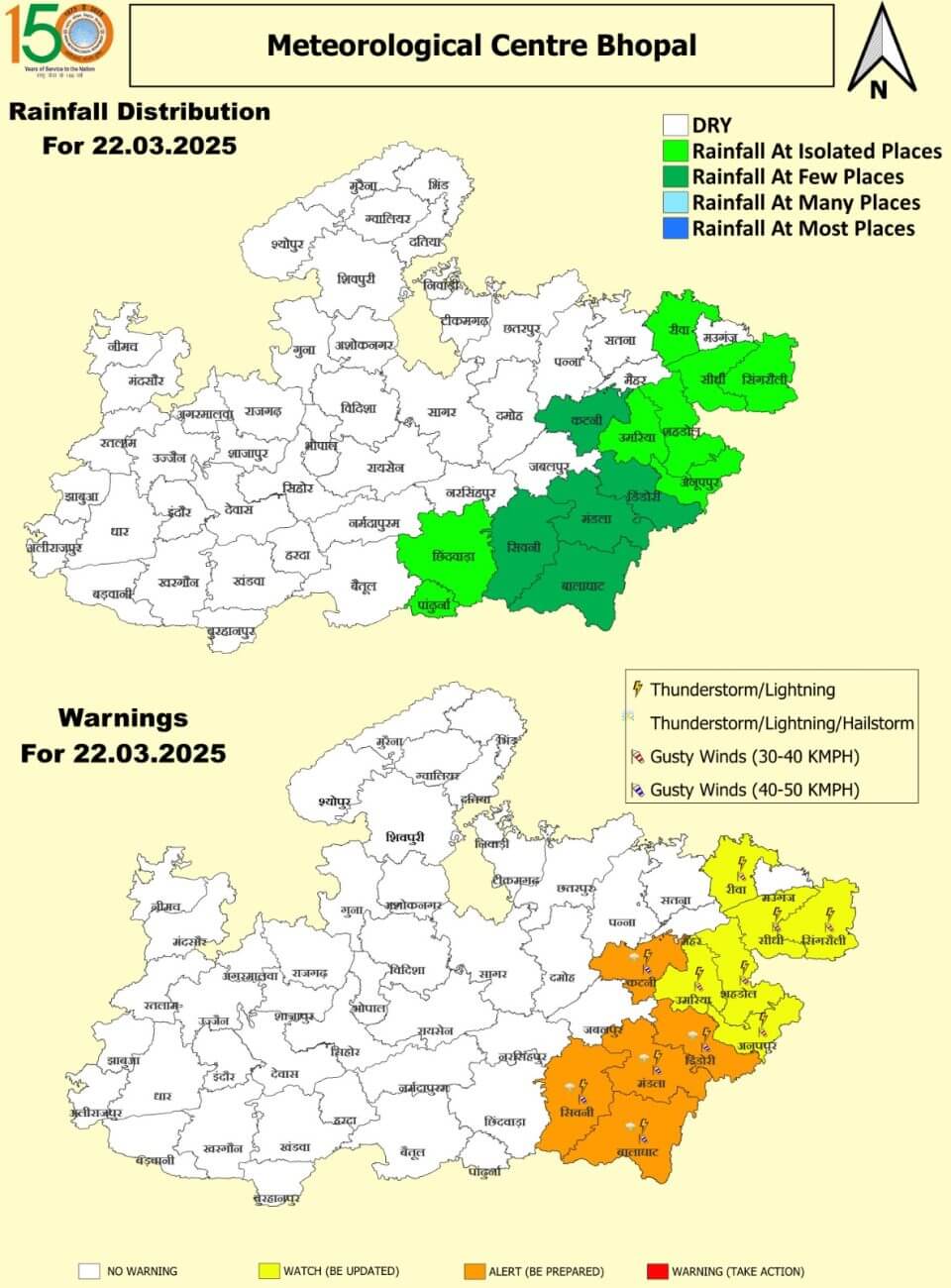 21 मार्च शुक्रवार को अनूपपुर, शहडोल, उमरिया, डिंडोरी, कटनी, दमोह, ग्वालियर, दतिया, भिंड और मुरैना जिले में तेज हवाओं के साथ बारिश और ओले गिरने का ऑरेंज अलर्ट जारी किया है। मंडला, नर्मदापुरम, बैतूल, हरदा, अशोकनगर, शिवपुरी, सिंगरौली, सीधी, रीवा, मऊगंज, सतना, जबलपुर, नरसिंहपुर, छिंदवाड़ा, सिवनी, मैहर और पांढुर्ना जिले में गरज-चमक के साथ बारिश की संभावना है।22 मार्च शनिवार को शहडोल, अनूपपुर और बालाघाट में गरज-चमक और हल्की बारिश हो सकती है।