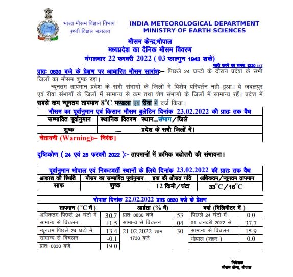 मौसम विभाग (MP Weather Forecast) के मुताबिक, आज 22 फरवरी 2022 मंगलवार को ईरान के आसपास सक्रिय पश्चिमी विक्षाेभ के प्रभाव से दक्षिण-पश्चिमी राजस्थान और उससे लगे दक्षिणी पाकिस्तान पर एक प्रेरित चक्रवात बनेगा, जिसके कारण दाे दिन तक दिन-रात के तापमान में बढ़ाेतरी हाेने लगेगी। दक्षिणी पश्चिम राजस्थान में ऊपरी हवा का चक्रवात बनने से इंदौर में हल्के बादल छा सकते हैं और पूर्वी मध्य प्रदेश में कहीं-कहीं हल्की बूंदाबांदी हो सकती है। वही ग्वालियर-जबलपुर सहित संभाग के जिलों में बादल छाने और बारिश की संभावना जताई गई है।वही 24 से 26 फरवरी के बीच कुछ इलाकों में हल्की बारिश और कहीं-कहीं हल्के बादल छा सकते हैं।