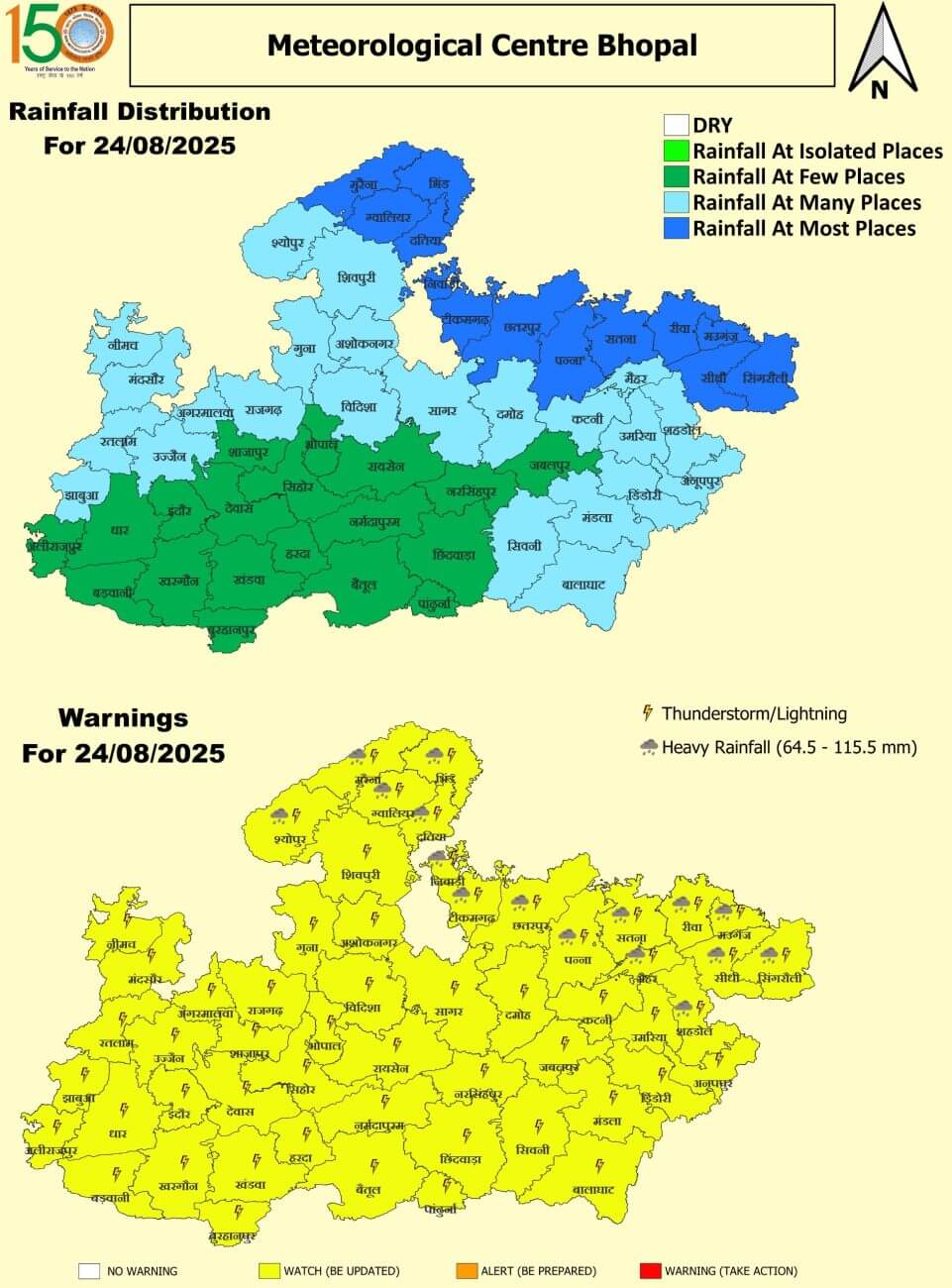 24 अगस्त: ग्वालियर, दतिया, भिंड, मुरैना, श्योपुरकलां, सिंगरौली, सीधी, रीवा, मऊगंज, सतना, शहडोल, पन्ना, छतरपुर, टीकमगढ़, निवाड़ी, मैहर भारी वर्षा, झंझावत और कहीं-कहीं वज्रपात।भोपाल, विदिशा, रायसेन, सिहोर, राजगढ़, नर्मदापुरम, बैतूल, हरदा, बुरहानपुर, खंडवा, खरगौन, बड़वानी, अलीराजपुर, झाबुआ, धार, इंदौर, रतलाम, उज्जैन, देवास, शाजापुर, आगर, मंदसौर, नीमच, गुना, अशोकनगर, शिवपुरी, अनुपपुर, उमरिया, डिंडोरी, कटनी, जबलपुर, नरसिंहपुर, छिंदवाड़ा, सिवनी, मंडला, बालाघाट, दमोह, सागर, पांढुर्णा झंझावत और वज्रपात कहीं-कहीं।