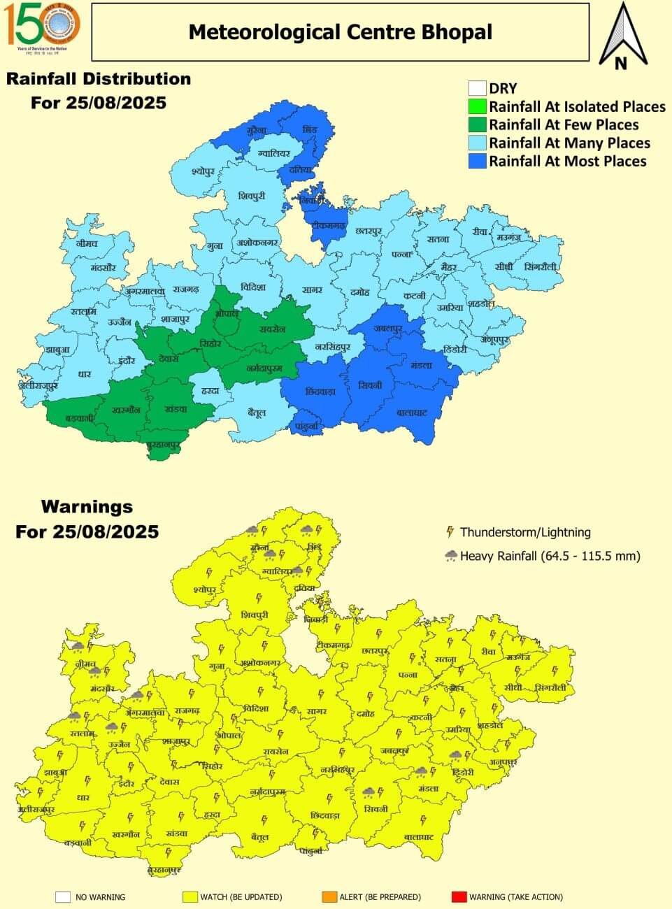 25 अगस्त: रतलाम, उज्जैन, आगर, मंदसौर, नीमच, ग्वालियर, दतिया, भिंड, मुरैना, डिंडोरी, सिवनी, मंडला भारी वर्षा, झंझावत और वज्रपात कहीं-कहीं।भोपाल, विदिशा, रायसेन, सिहोर, राजगढ़, नर्मदापुरम, बैतूल, हरदा, बुरहानपुर, खंडवा, खरगौन, बड़वानी, अलीराजपुर, झाबुआ, धार, इंदौर, देवास, शाजापुर, गुना, अशोकनगर, शिवपुरी, श्योपुरकलां, सिंगरौली, सीधी, रीवा, मऊगंज, सतना, अनुपपुर, शहडोल, उमरिया, कटनी, जबलपुर, नरसिंहपुर, छिंदवाड़ा, बालाघाट, पन्ना, दमोह, सागर, छतरपुर, टीकमगढ़, निवाड़ी, मैहर, पांढुर्णा झंझावत और वज्रपात कहीं-कहीं।