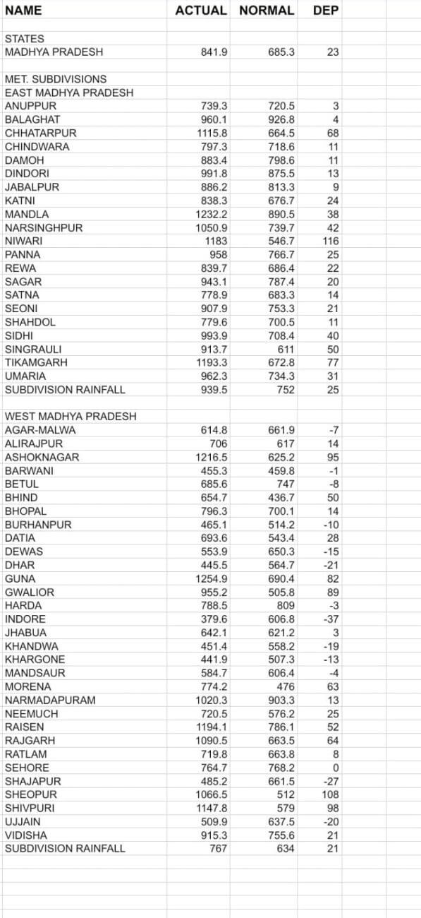 - मध्य प्रदेश में दीर्घावधि औसत से 23% अधिक वर्षा हुई है। पूर्वी मध्य प्रदेश में औसत से 25% और पश्चिमी मध्य प्रदेश 21% अधिक वर्षा हुई है। अब तक औसत 33.1 इंच बारिश हो चुकी है यानि 6.1 इंच पानी ज्यादा गिरा है। प्रदेश की सामान्य बारिश औसत 37 इंच है। अब तक 89 प्रतिशत पानी गिर चुका है।