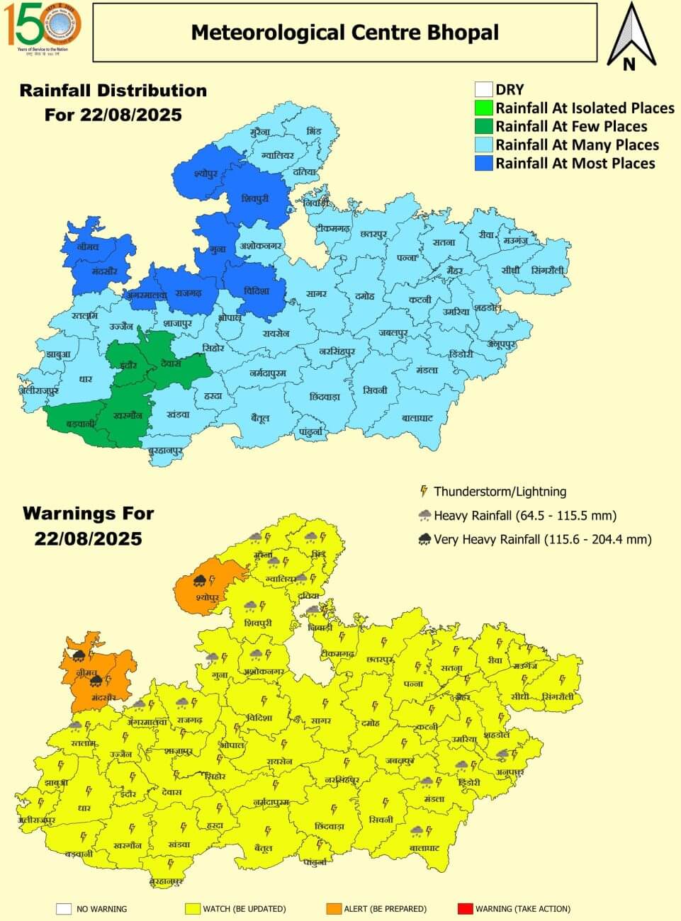 22 अगस्त: मंदसौर, नीमच, श्योपुरकलां अति भारी वर्षा, झंझावत और वज्रपात कहीं-कहीं। राजगढ़, रतलाम, आगर, गुना, अशोकनगर, शिवपुरी, ग्वालियर, दतिया, भिंड, मुरैना, अनुपपुर, डिंडोरी, मंडला, बालाघाट, निवाड़ी भारी वर्षा, झंझावत और कहीं-कहीं वज्रपात। भोपाल, विदिशा, रायसेन, सिहोर, नर्मदापुरम, बैतूल, हरदा, बुरहानपुर, खंडवा, खरगौन, बड़वानी, अलीराजपुर, झाबुआ, धार, इंदौर, उज्जैन, देवास, शाजापुर, सिंगरौली, सीधी, रीवा, मऊगंज, सतना,शहडोल, उमरिया, कटनी, जबलपुर, नरसिंहपुर, छिंदवाड़ा, सिवनी, पन्ना, दमोह, सागर, छतरपुर, टीकमगढ़, मैहर, पांढुर्णा झंझावत और वज्रपात कहीं-कहीं
