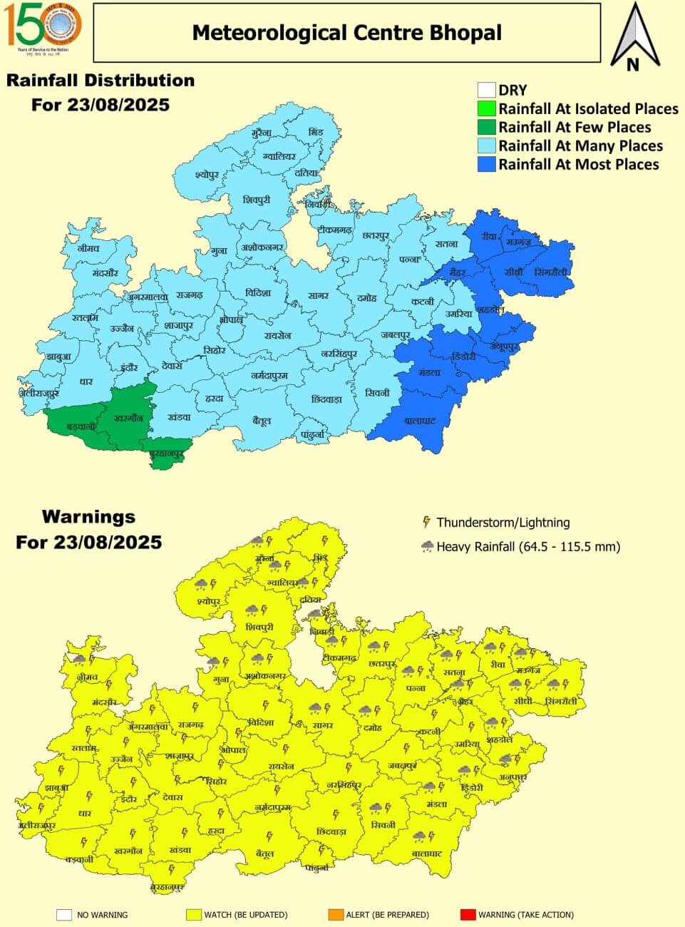 23 अगस्त: नीमच, गुना, अशोकनगर, शिवपुरी, ग्वालियर, दतिया, मुरैना, श्योपुरकलां, सिंगरौली, सीधी, रीवा, मऊगंज, सतना, अनुपपुर, शहडोल, डिंडोरी, सिवनी, मंडला, बालाघाट, पन्ना, दमोह, सागर, छतरपुर, टीकमगढ़, निवाड़ी, मैहर भारी वर्षा, झंझावत और वज्रपात कहीं-कहीं। भोपाल, विदिशा, रायसेन, सिहोर, राजगढ़, नर्मदापुरम, बैतूल, हरदा, बुरहानपुर, खंडवा, खरगौन, बड़वानी, अलीराजपुर, झाबुआ, धार, इंदौर, रतलाम, उज्जैन, देवास, शाजापुर, आगर, मंदसौर, भिंड, उमरिया, कटनी, जबलपुर, नरसिंहपुर, छिंदवाड़ा, पांढुर्णा झंझावत और वज्रपात कहीं-कहीं।
