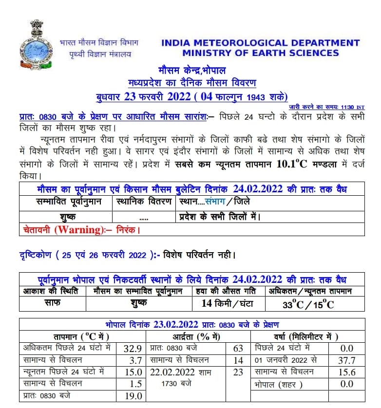 मौसम विभाग (MP Weather Forecast) के मुताबिक, पिछले 24 घंटे में सबसे न्यूनतम तापमान मंडला में 10.1 डिग्री सेल्सियस दर्ज किया गया। वर्तमान में अफगानिस्तान के आसपास एक पश्चिमी विक्षोभ ट्रफ के रूप में बनने के चलते राजस्थान और उससे लगे पाकिस्तान पर एक प्रेरित चक्रवात बन गया है। इन 2 सिस्टम के प्रभाव से हवाओं का रुख भी बार-बार बदलने लगा है।वही उत्तर भारत के पहाड़ों पर बर्फबारी होने के आसार हैं, हालांकि अभी दो दिन तक प्रदेश में मौसम का मिजाज इसी तरह बना रहने की संभावना है।
