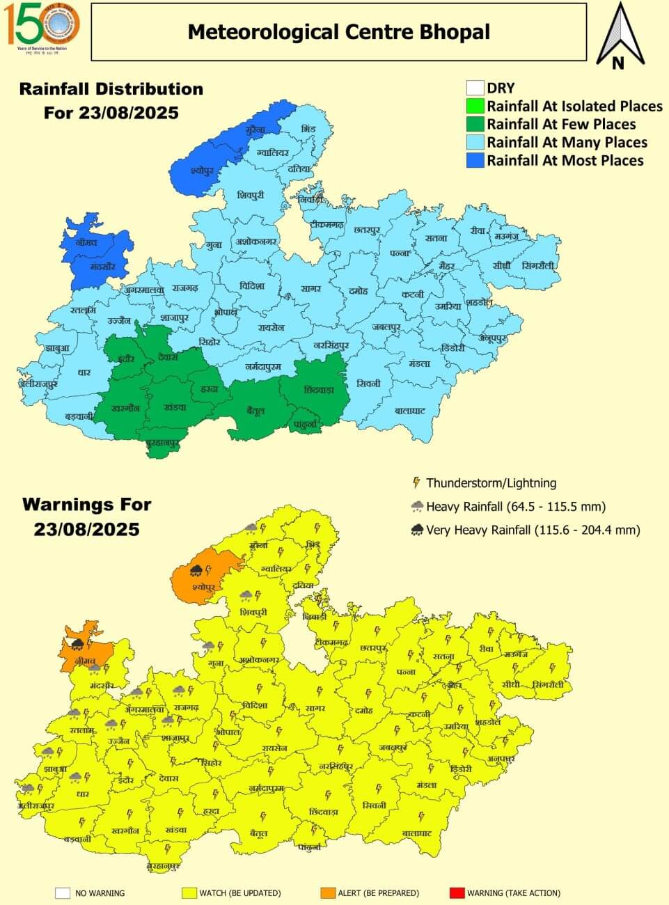 मानसून ट्रफ और साइक्लोनिक सर्कुलेशन सिस्टम के चलते मध्य प्रदेश में वर्षा का क्रम जारी है। आज शनिवार को 2 जिलों में अति भारी और 12 जिलों में भारी बारिश का अलर्ट जारी किया गया है। यहां अगले 24 घंटे में साढ़े 8 इंच तक पानी गिर सकता है। बाकी जिलों में बिजली गिरने चमकने और मेघगर्जन के साथ हल्की बारिश का दौर जारी रह सकता है।फिलहाल 26 अगस्त तक मौसम का मिजाज यूही बना रहेगा।श्योपुर, शिवपुरी, गुना, मंदसौर और रतलाम में बाढ़ का खतरा बना हुआ है।