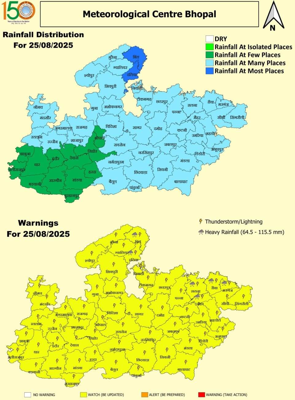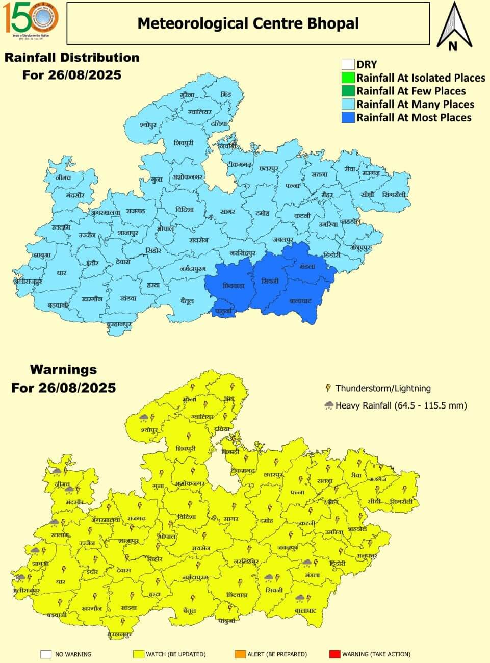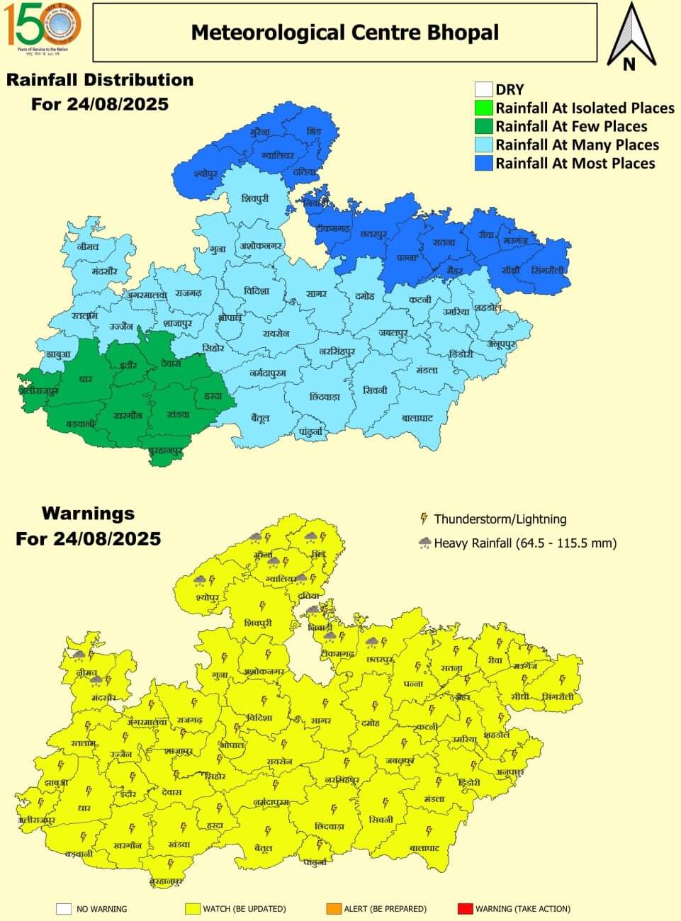 - राजगढ़, अलीराजपुर, झाबुआ, धार, रतलाम, उज्जैन, शाजापुर, आगर, मंदसौर, गुना, शिवपुरी, मुरैना भारी वर्षा, झंझावत कहीं-कहीं और वज्रपात