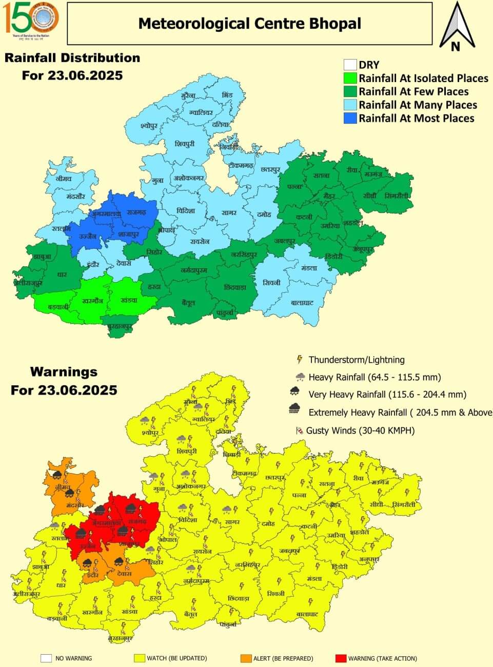 - सोमवार 23 जूनः उज्जैन, शाजापुर, आगर-मालवा राजगढ़ में अति भारी बारिश रेड अलर्ट। नीमच, मंदसौर, इंदौर और देवास में ऑरेंज अलर्ट ।ग्वालियर, श्योपुर, शिवपुरी, गुना, अशोकनगर, रतलाम, सीहोर, नर्मदापुरम, विदिशा और सागर में भारी बारिश की संभावना है। भोपाल समेत अन्य जिलों में आंधी-बारिश ।