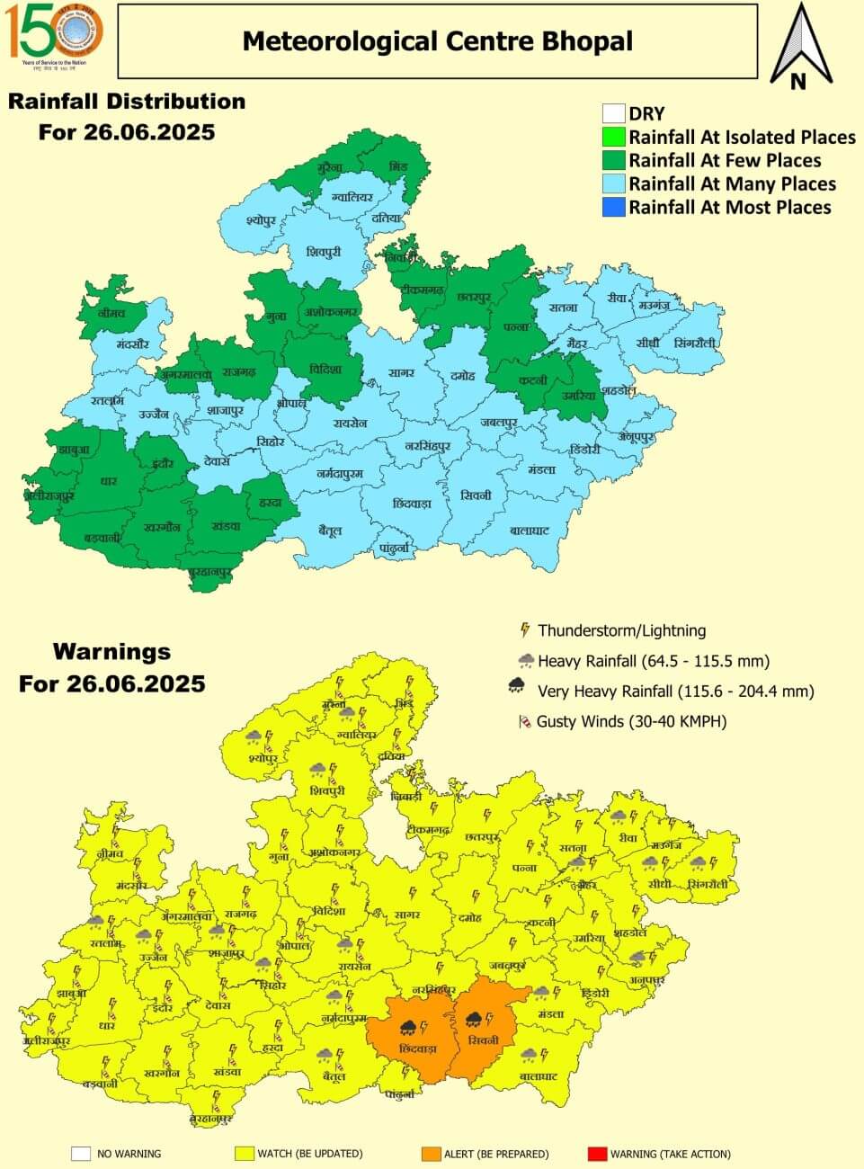 - गुरूवार 26 जून: छिंदवाड़ा-सिवनी में अति भारी बारिश । ग्वालियर, श्योपुर, शिवपुरी, रतलाम, उज्जैन, शाजापुर, सीहोर, रायसेन, नर्मदापुरम, बैतूल, बालाघाट, मंडला, अनूपपुर, मैहर, रीवा, सीधी और सिंगरौली में भारी बारिश ।अन्य जिलों में भी आंधी-बारिश ।