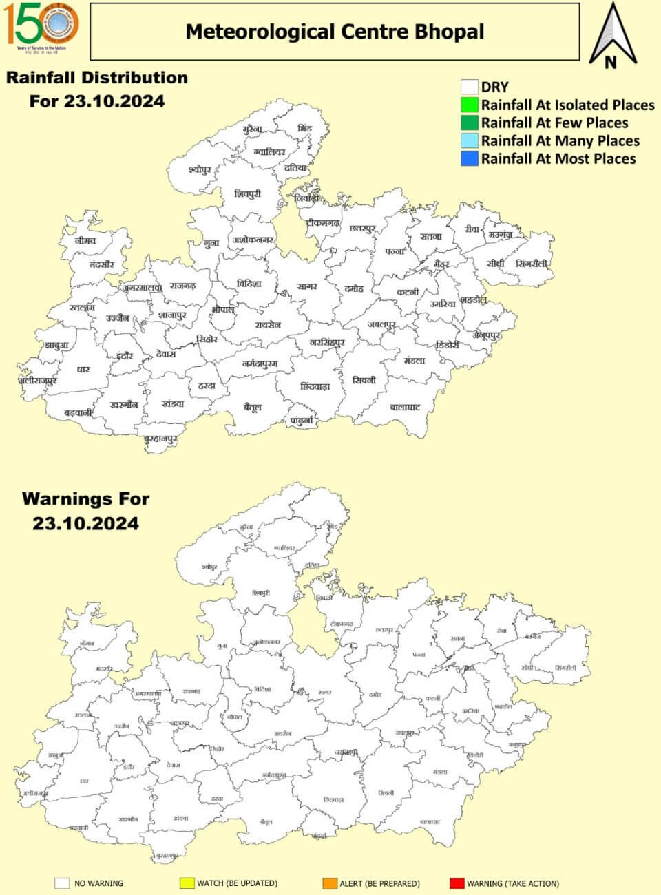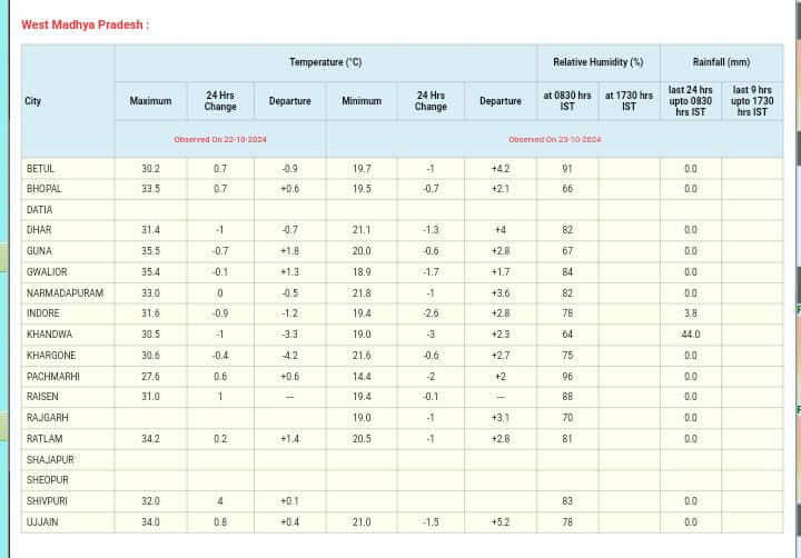 एमपी मौसम विभाग की मानें तो 24 अक्टूबर को एक नया वेदर सिस्टम एक्टिव हो रहा है, जिसके प्रभाव से 25 अक्टूबर से पूर्वी मध्य प्रदेश में एक बार फिर गरज-चमक के साथ बारिश होने का अनुमान है।इसके साथ ही इंदौर संभाग में बुधवार को बारिश के आसार है।