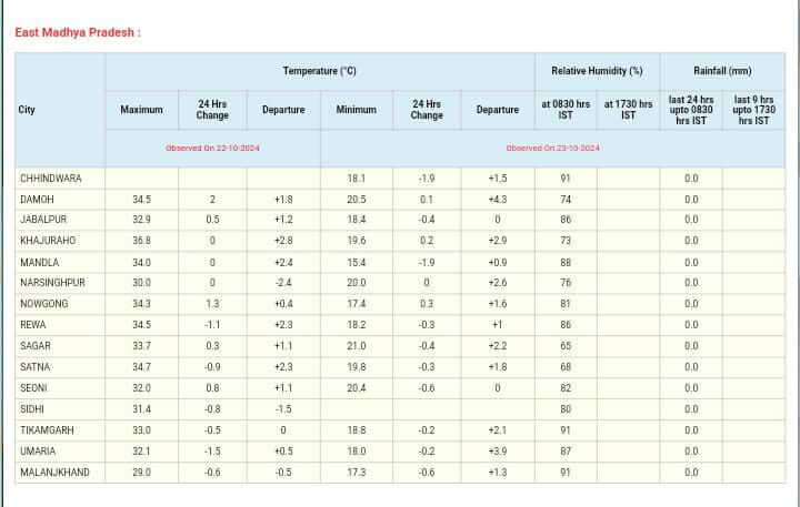 - हिल स्टेशन पचमढ़ी में रात का तापमान 17 डिग्री सेल्सियस रिकॉर्ड किया गया।