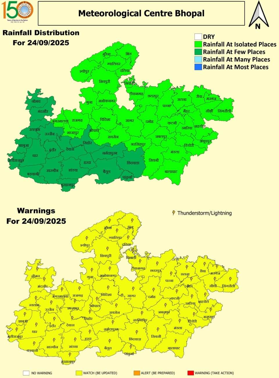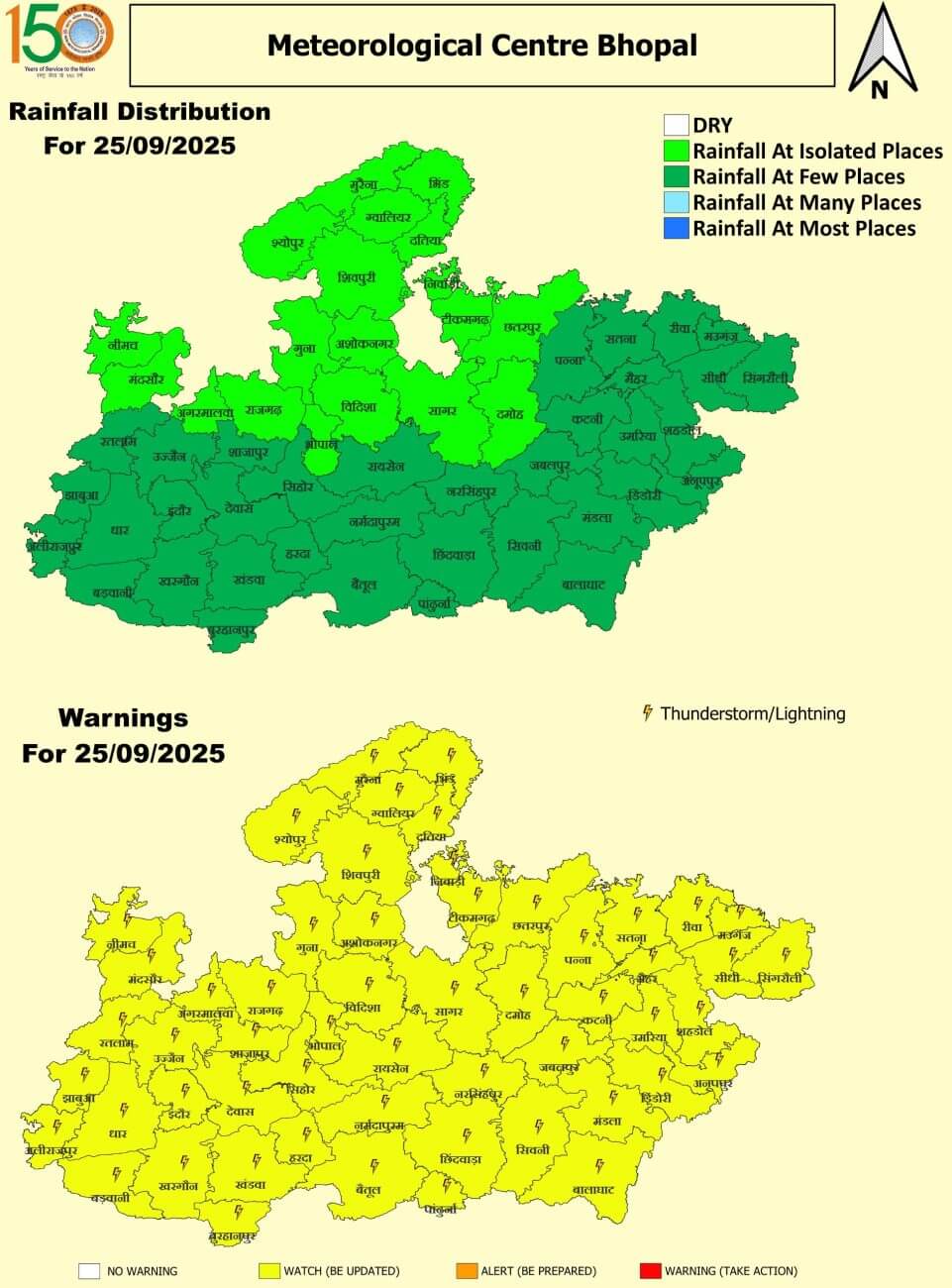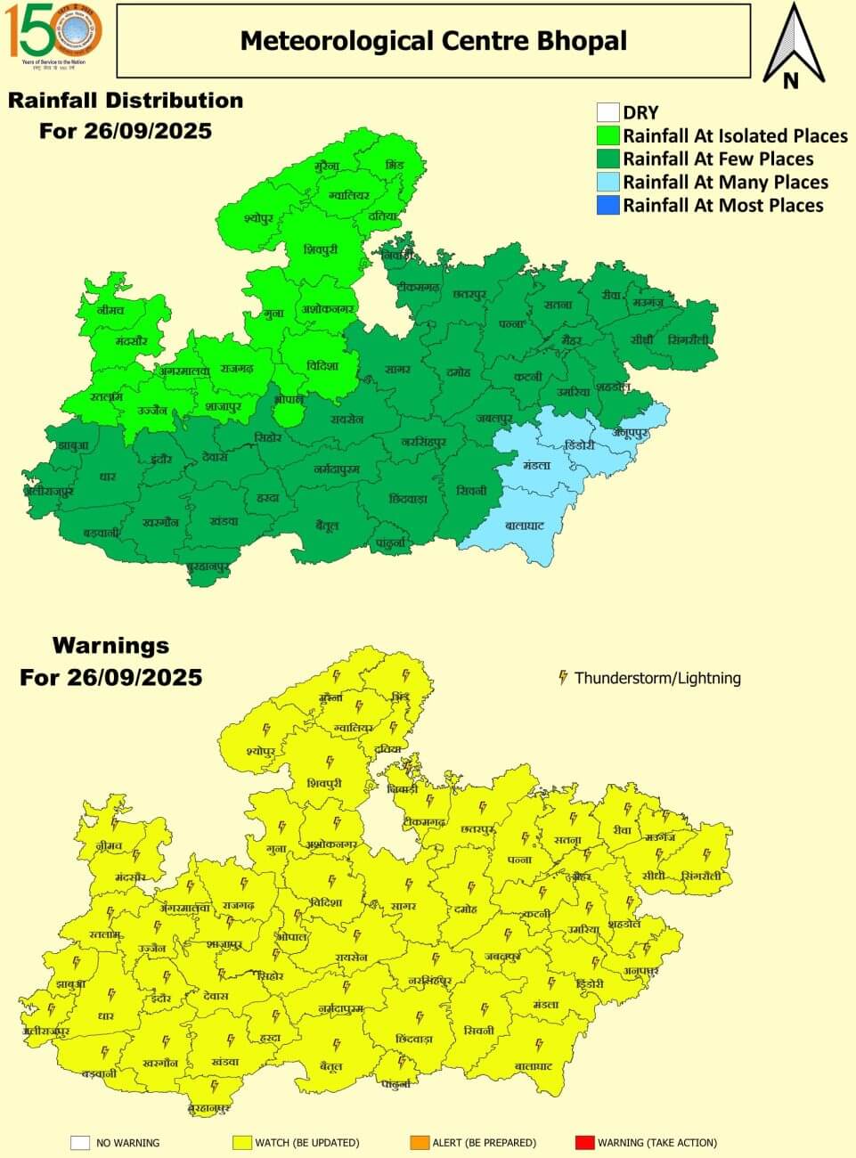 - भोपाल, विदिशा, रायसेन, सीहोर, राजगढ़, नर्मदापुरम, हरदा, बैतूल, बुरहानपुर, खंडवा, खरगोन, बड़वानी, अलीराजपुर, झाबुआ, धार, इंदौर, देवास, छिंदवाड़ा, पांढुर्णा, रतलाम, उज्जैन, शाजापुर, आगर, मंदसौर, नीमच, गुना, अशोकनगर, शिवपुरी, ग्वालियर, दतिया, भिंड, मुरैना, श्योपुरकलां, सिंगरौली, सीधी, रीवा, मऊगंज, सतना, शहडोल, उमरिया, कटनी, जबलपुर, नरसिंहपुर, पन्ना, दमोह, सागर, छतरपुर, टीकमगढ़, निवाड़ी और मैहर में हल्की बारिश