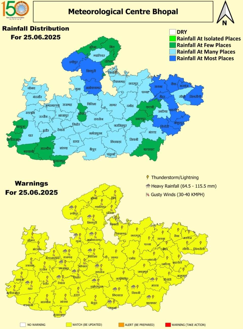 बुधवार 25 जूनः ग्वालियर, शिवपुरी, सीहोर, सागर, दमोह, रायसेन, नर्मदापुरम, छिंदवाड़ा, नरसिंहपुर, रीवा और सीधी में भारी बारिश । भोपाल, इंदौर, उज्जैन, जबलपुर समेत अन्य जिलों में भी हल्की से मध्यम बारिश ।