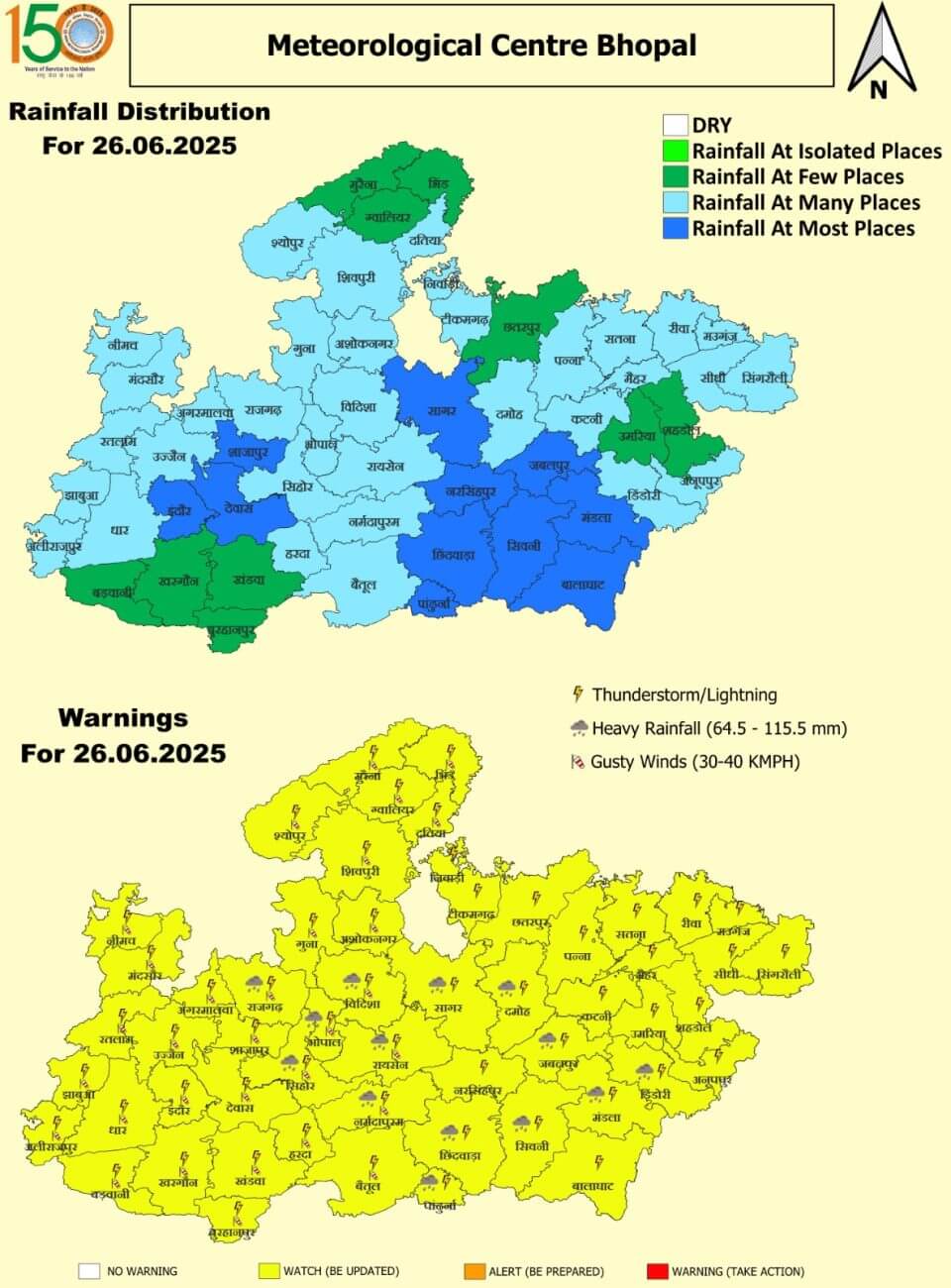 गुरूवार 26 जून: भोपाल, राजगढ़, विदिशा, सीहोर, विदिशा, सागर, रायसेन, नर्मदापुरम, दमोह, जबलपुर, छिंदवाड़ा, पांढुर्णा, सिवनी, मंडला और डिंडौरी में भारी बारिश ।अन्य जिलों में आंधी-बारिश ।