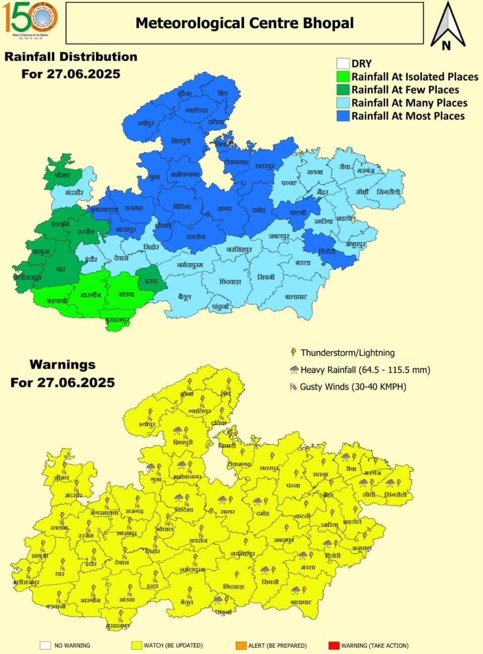 - विदिशा, रायसेन, सीहोर, नर्मदापुरम, अलीराजपुर, झाबुआ, रतलाम, उज्जैन, देवास, आगर मालवा, मंदसौर, नीमच, गुना, श्योपुर, नरसिंहपुर, छिंदवाड़ा, सिवनी, मंडला और सागर जिलों में भारी बारिश ।