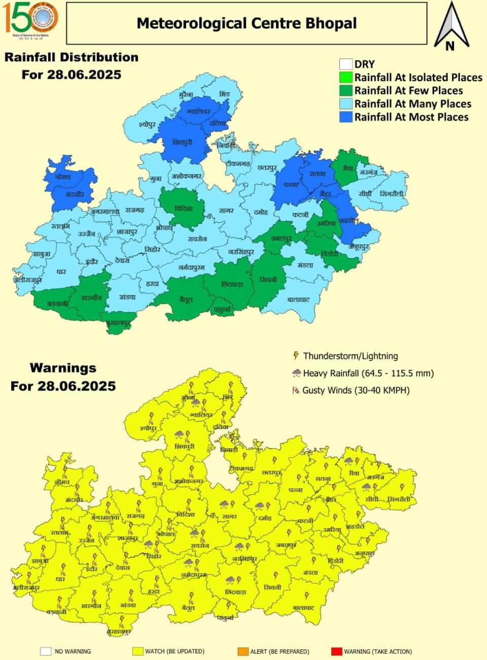 शनिवार 28 जून: ग्वालियर, शिवपुरी, सीहोर, सागर, रायसेन, नर्मदापुरम, नरसिंहपुर, दमोह, छिंदवाड़ा, रीवा और सीधी में भारी बारिश । भोपाल, इंदौर, उज्जैन, जबलपुर समेत अन्य जिलों में बारिश ।