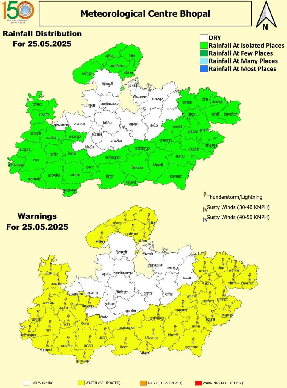 25 मई रविवार: छिंदवाड़ा, पांढुर्णा, सिवनी, मंडला और बालाघाट में तेज आंधी का अलर्ट है। मुरैना, भिंड, दतिया, अलीराजपुर, बड़वानी, खरगोन, खंडवा, बुरहानपुर, हरदा, नर्मदापुरम, बैतूल, उमरिया, डिंडौरी, अनूपपुर, शहडोल, मैहर, मऊगंज, सीधी और सिंगरौली में आंधी-बारिश का दौर रहेगा।