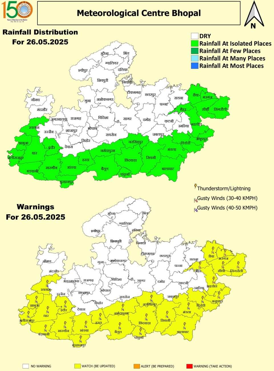 26 मई सोमवार: रतलाम, उज्जैन, इंदौर, धार, खरगोन, बड़वानी, अलीराजपुर, झाबुआ, पन्ना, सतना, रीवा, मऊगंज, सीधी, सिंगरौली, कटनी, मैहर, उमरिया, शहडोल, अनूपपुर, डिंडौरी, मंडला, सिवनी और बालाघाट में तेज आंधी और बारिश का अलर्ट ।
