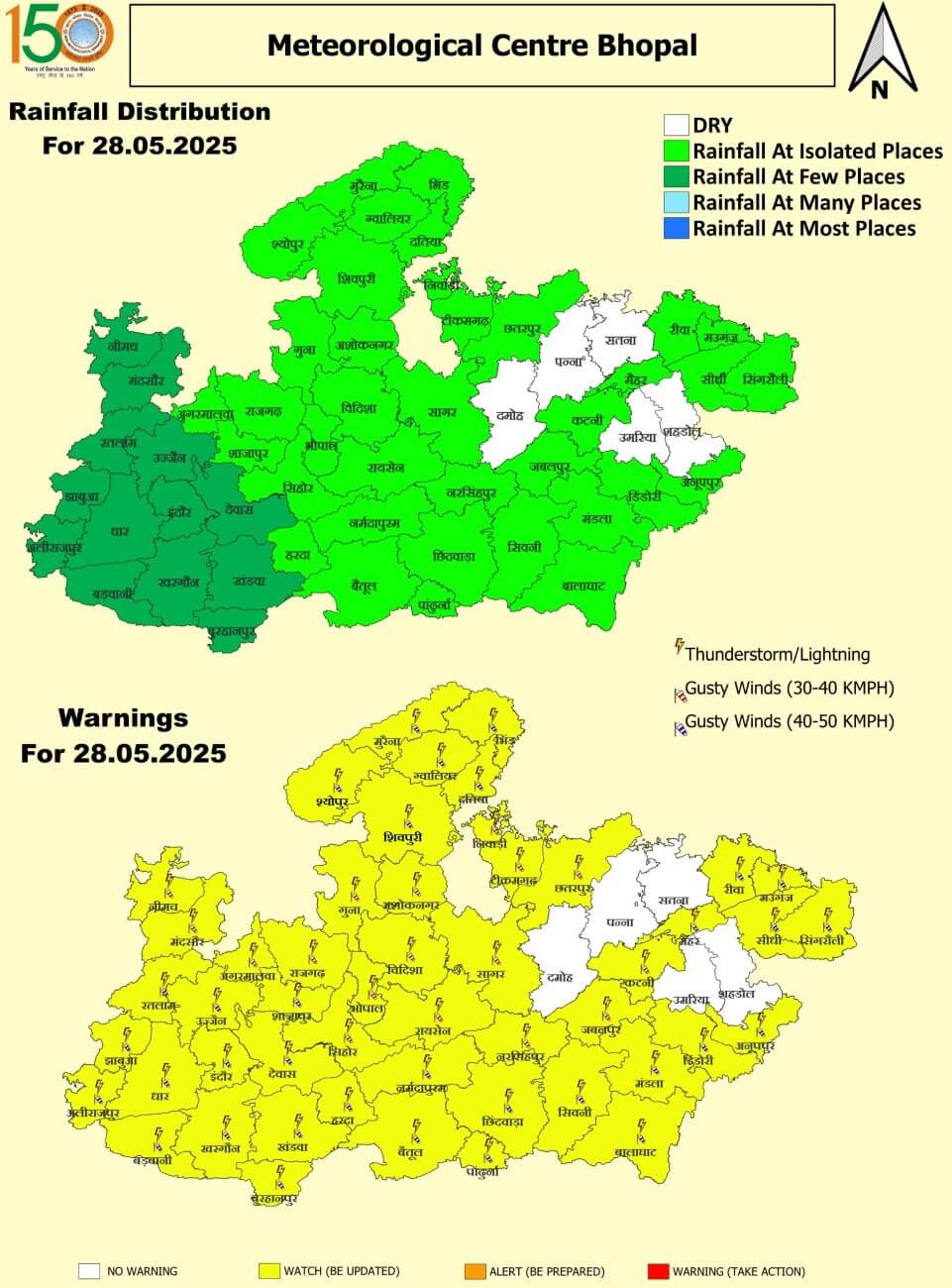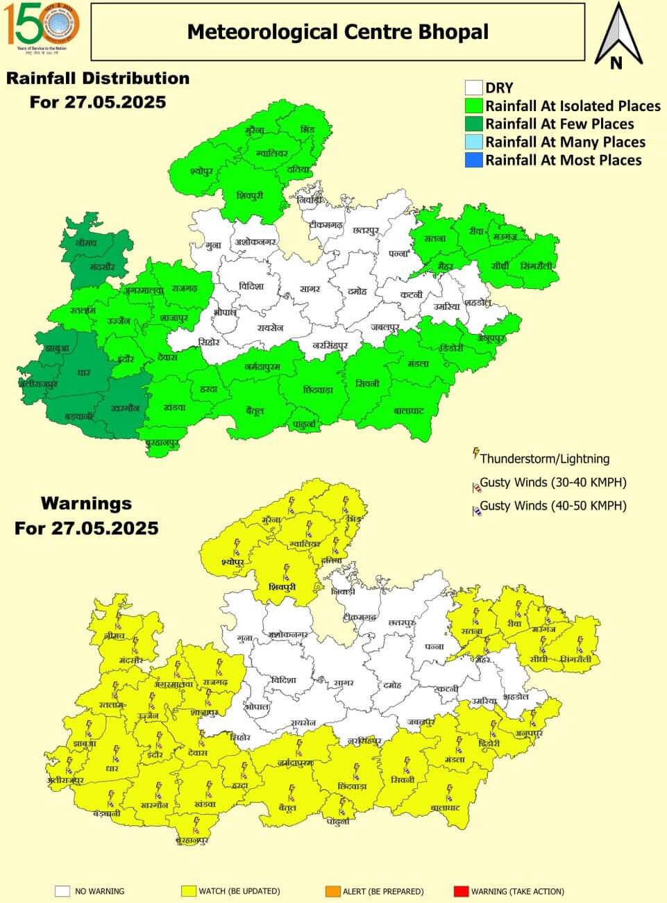 27 मई मंगलवार: भोपाल, इंदौर, उज्जैन, निवाड़ी, टीकमगढ़, छतरपुर, रीवा, सीधी, सिंगरौली, पन्ना, दमोह, मंडला, बालाघाट, सिवनी, पांढुर्णा, छिंदवाड़ा, सागर, विदिशा, रायसेन, नर्मदापुरम, बैतूल, हरदा, सीहोर, शाजापुर, देवास, खंडवा, बुरहानपुर, खरगोन, बड़वानी, धार, अलीराजपुर, झाबुआ, रतलाम, मंदसौर, शिवपुरी, अशोकनगर, गुना, राजगढ़, आगर-मालवा, सतना, मैहर, मऊगंज, उमरिया, शहडोल, अनूपपुर, डिंडौरी और नीमच में बारिश /हवा की रफ्तार 30 से 50 किलोमीटर प्रतिघंटा तक ।